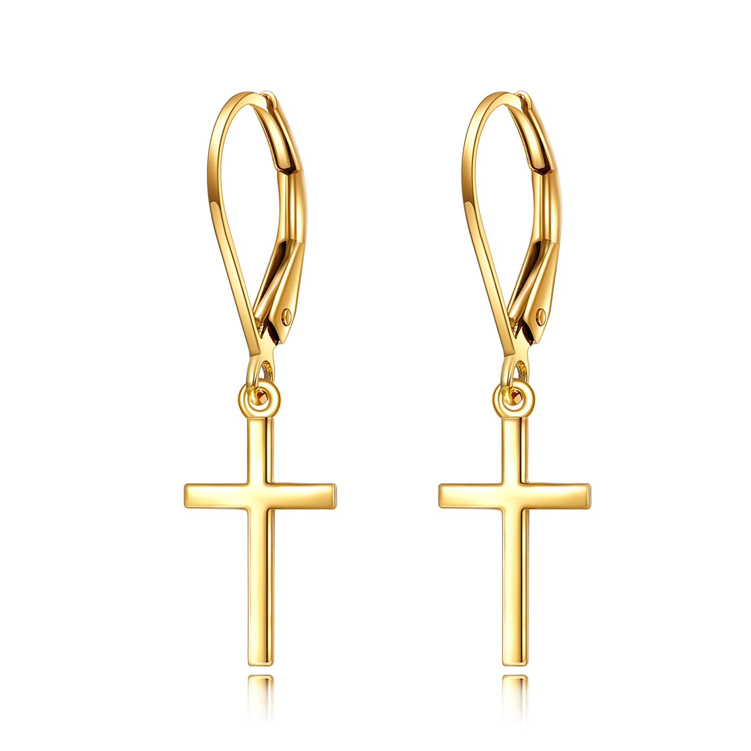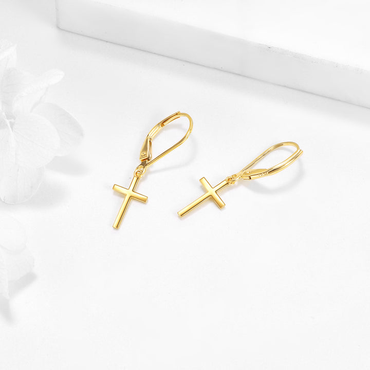 Lever-back earrings crafted from sterling silver, yellow gold plated. Features a cross motif. No set gemstones. Secured with lever-back closures.
