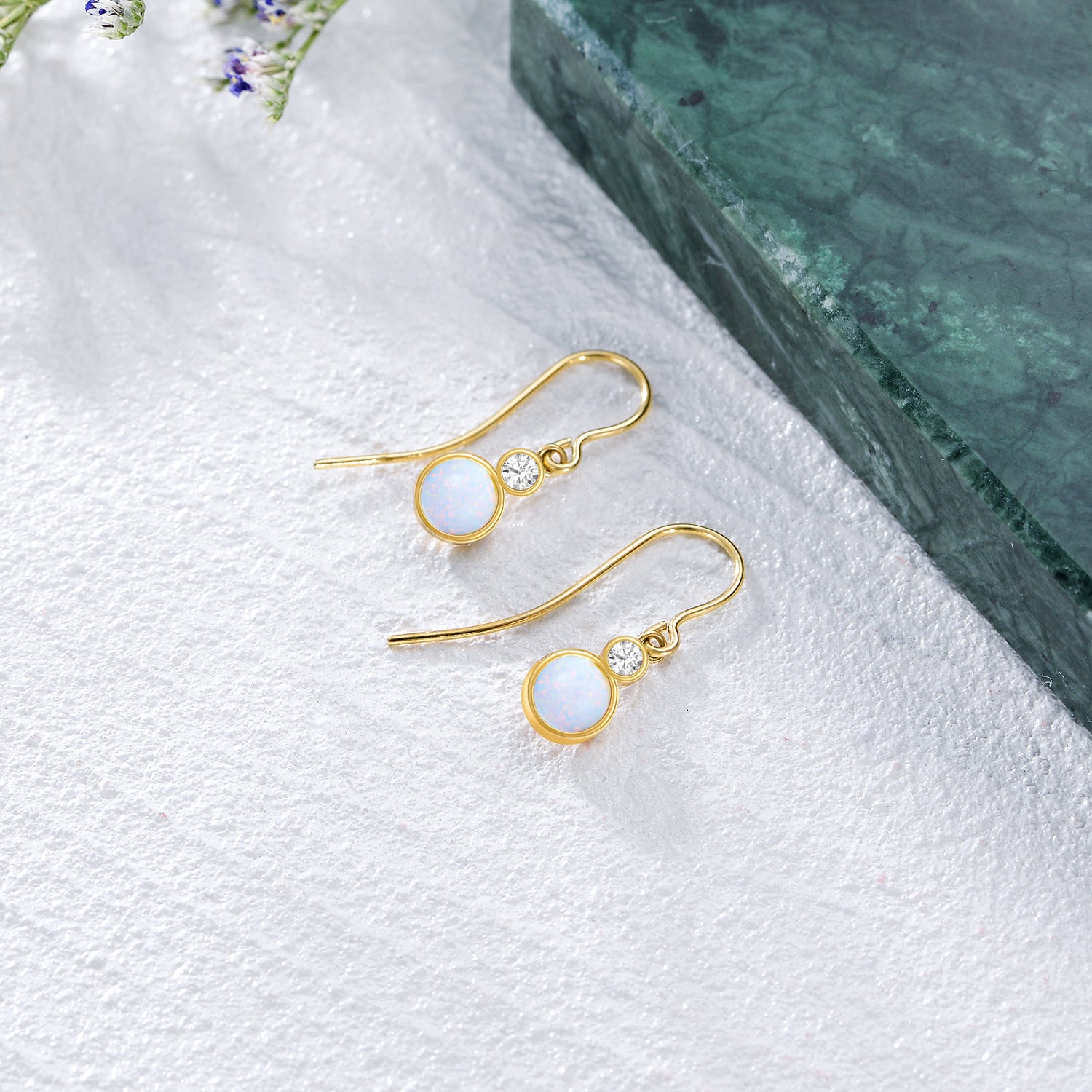 These Women's Drop Earrings are Crafted with Premium 14K Gold, Featuring Mesmerizing Round Opal Stones.
