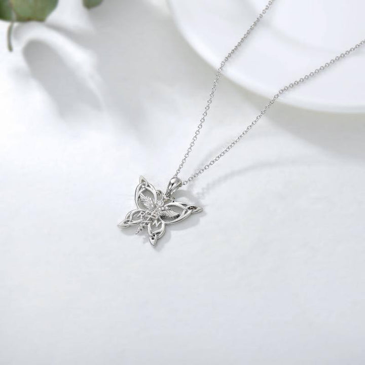 This no-stone Round Pendant Necklace is crafted from Premium Sterling Silver with White Gold Plating, Featuring a Delicate Butterfly Motif.