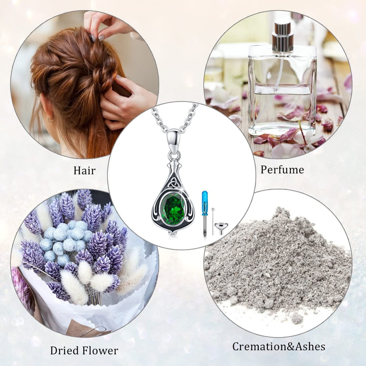This Sterling Silver Crystal Drop Shape Celtic Knot Urn Necklace for Ashes by YFN unites heartfelt remembrance with intricate artistry. The elegant drop-shaped design, enhanced by a brilliant emerald crystal, symbolizes renewal and emotional depth. Celtic knot detailing embodies eternity and unbreakable bonds, making the piece especially meaningful for both men and women. Crafted in retro-style sterling silver, the necklace includes a discreet compartment for ashes, allowing cherished memories to be held close. Combining beauty, symbolism, and functionality, this urn necklace becomes a touching memorial and a refined accessory suitable for everyday wear.
