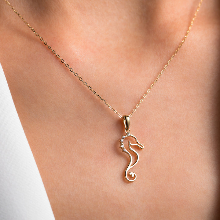 This 9K Gold Round Moissanite Seahorse Pendant Necklace by YFN evokes oceanic grace with its delicately sculpted seahorse wrapped around a luminous Moissanite center. The seahorse symbolizes patience, protection, and gentle strength, offering a meaningful addition to any jewelry collection. Its warm gold glow enhances the serene coastal charm, creating a beautifully detailed piece for women who love unique designs.