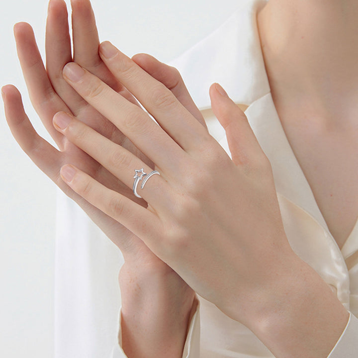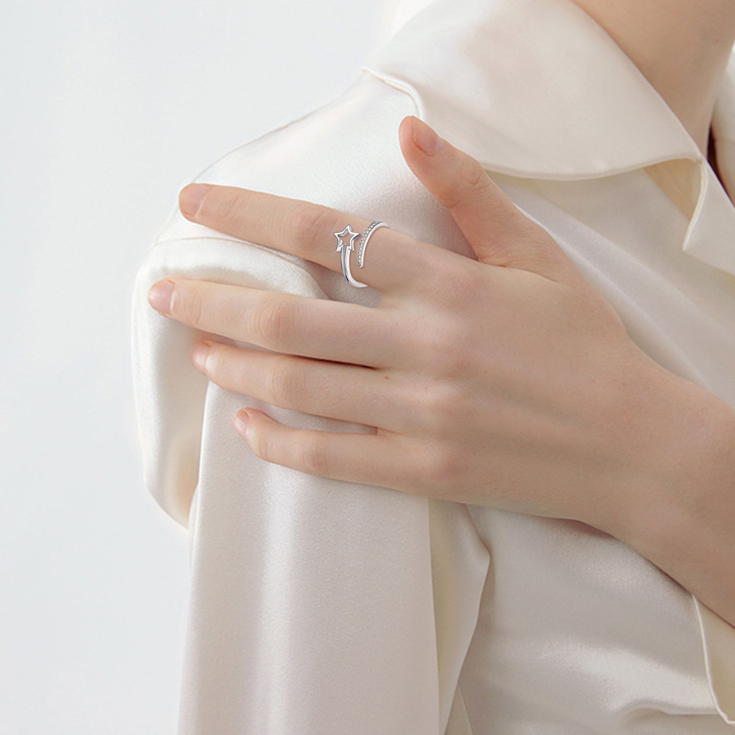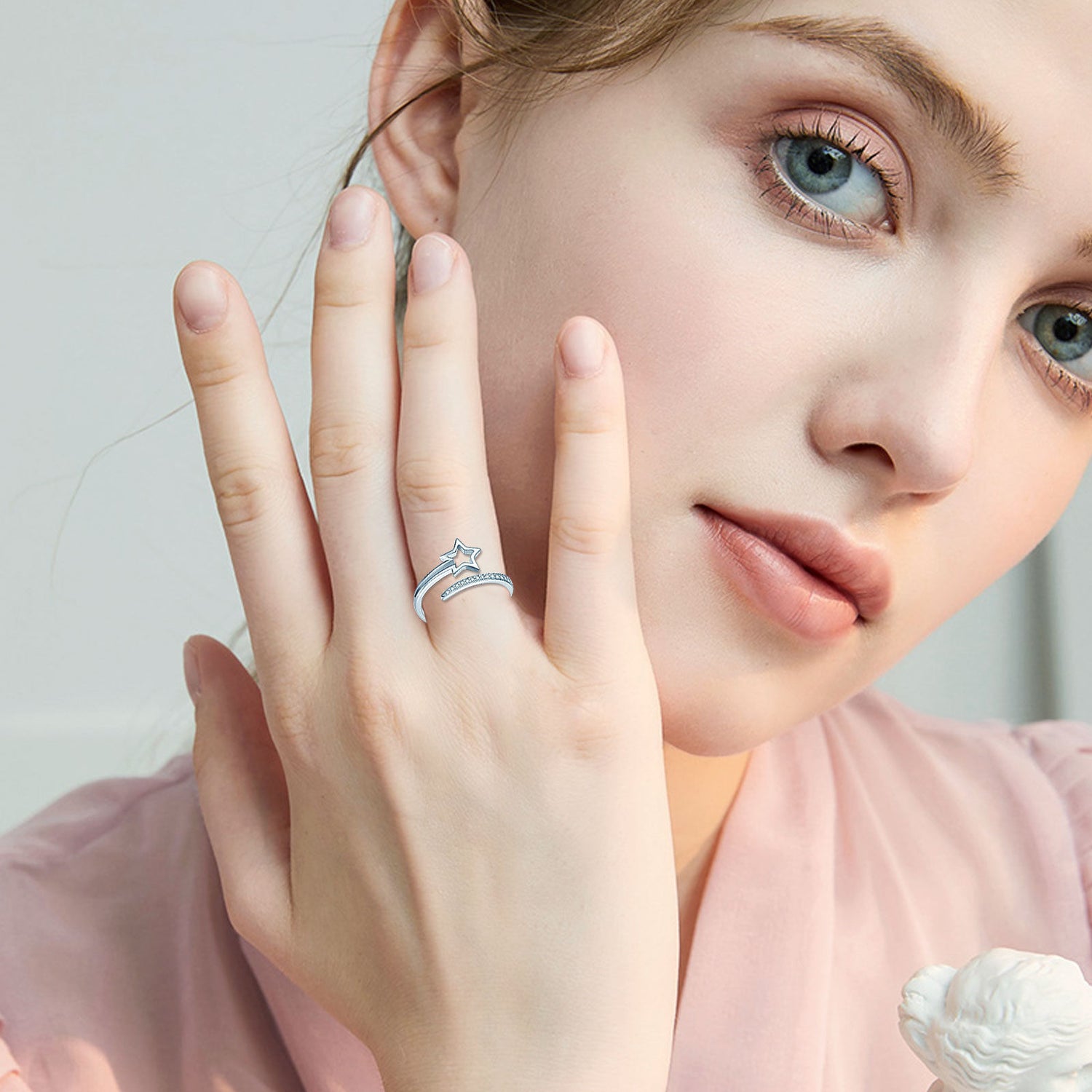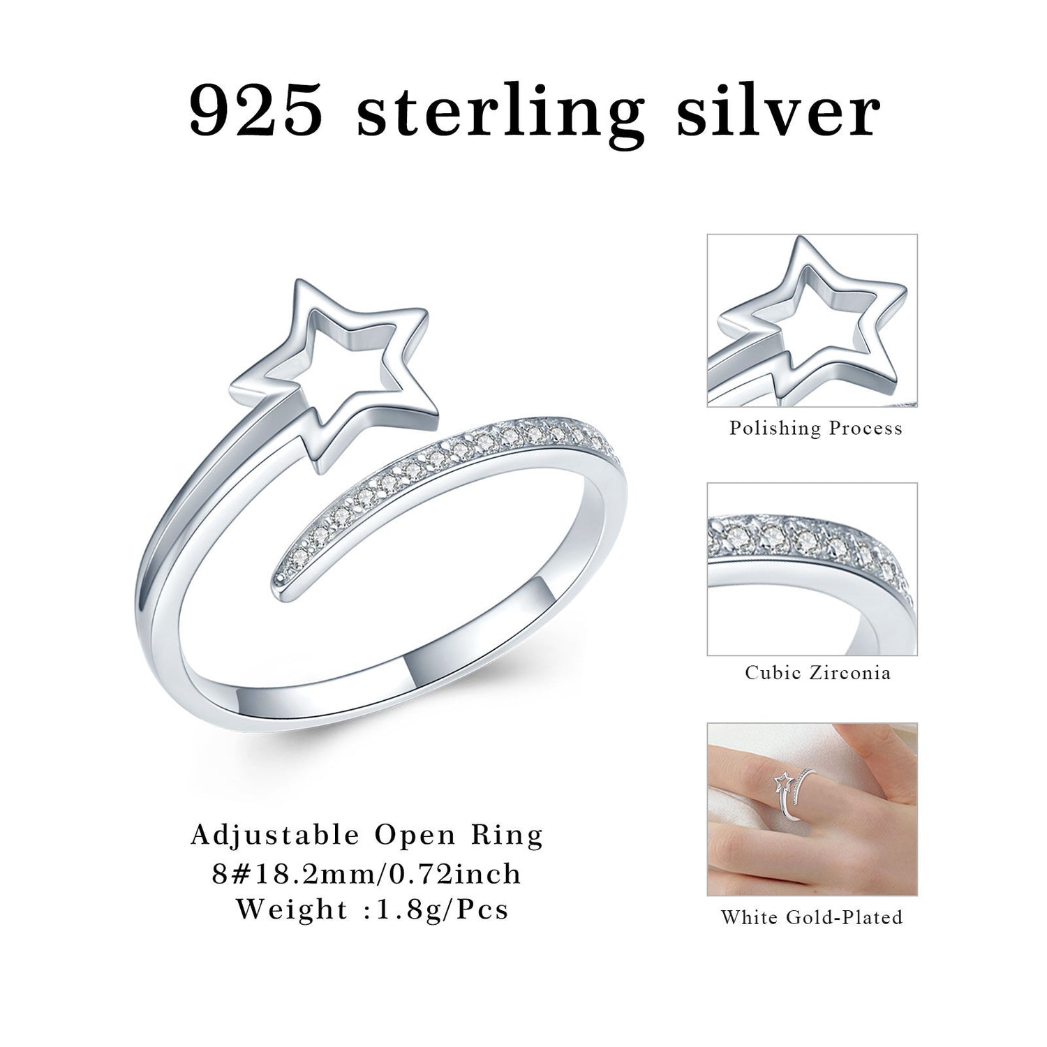 This Sterling Silver Round Shaped Cubic Zirconia Star Open Ring by YFN is an elegant open ring for women. Crafted from premium Sterling silver and finished with a luxurious White gold plating, it features a chic round design adorned with sparkling Cubic zirconia stars, ensuring lasting beauty and sophistication.