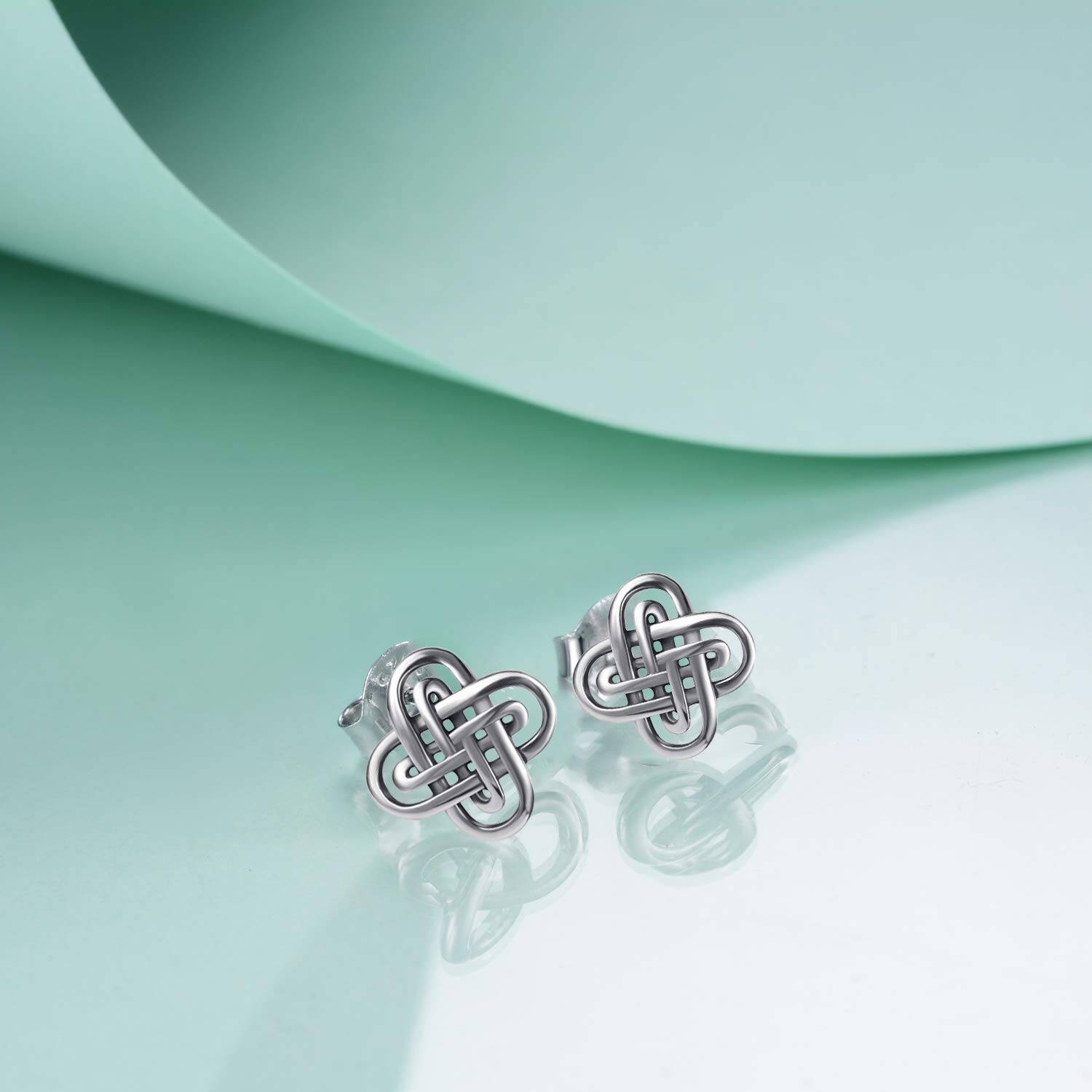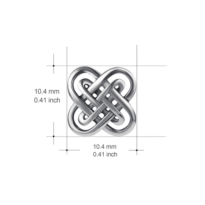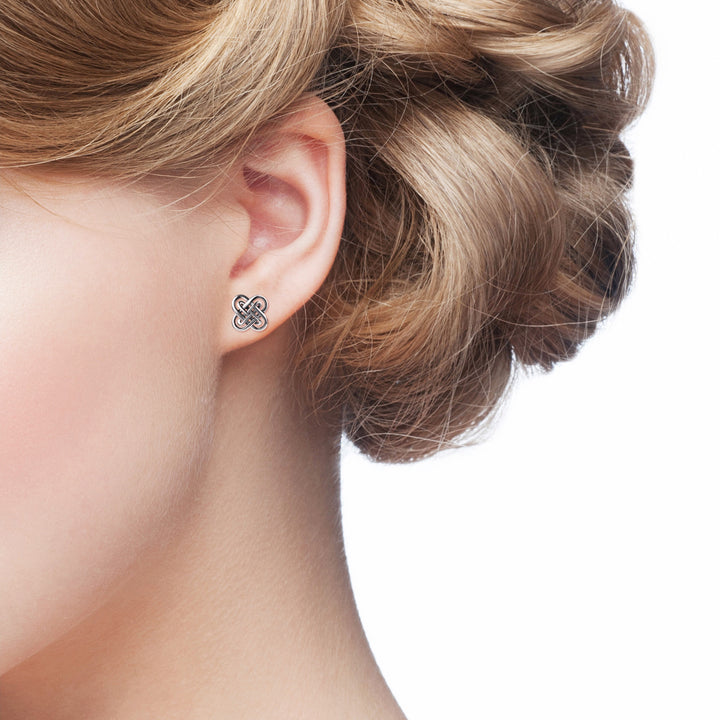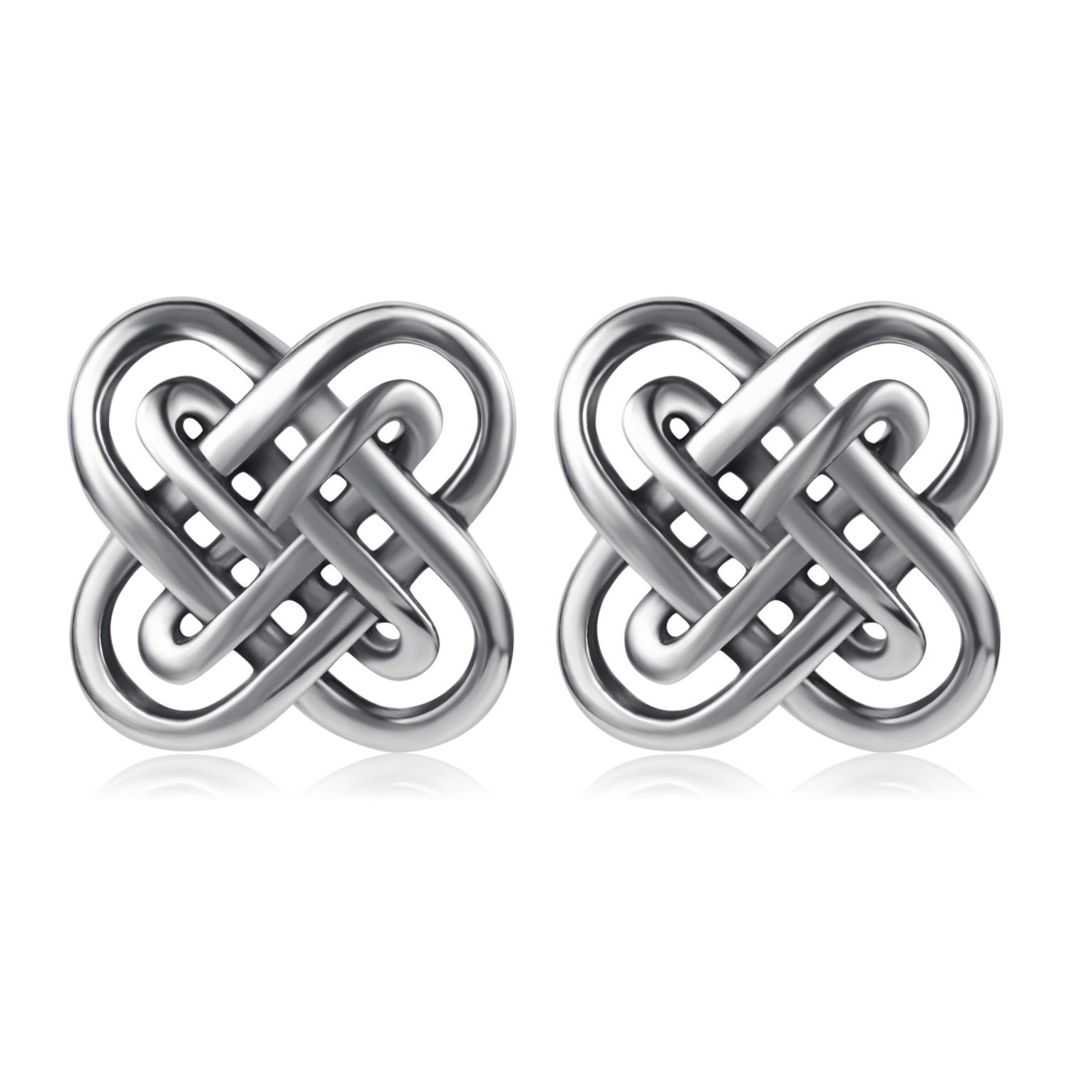 Sterling silver; white gold plating; Celtic knot stud earrings; no stones.