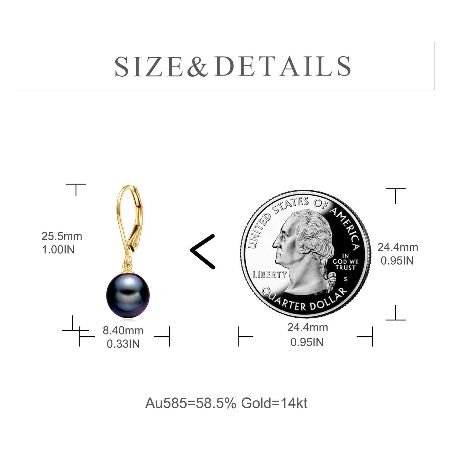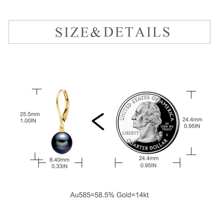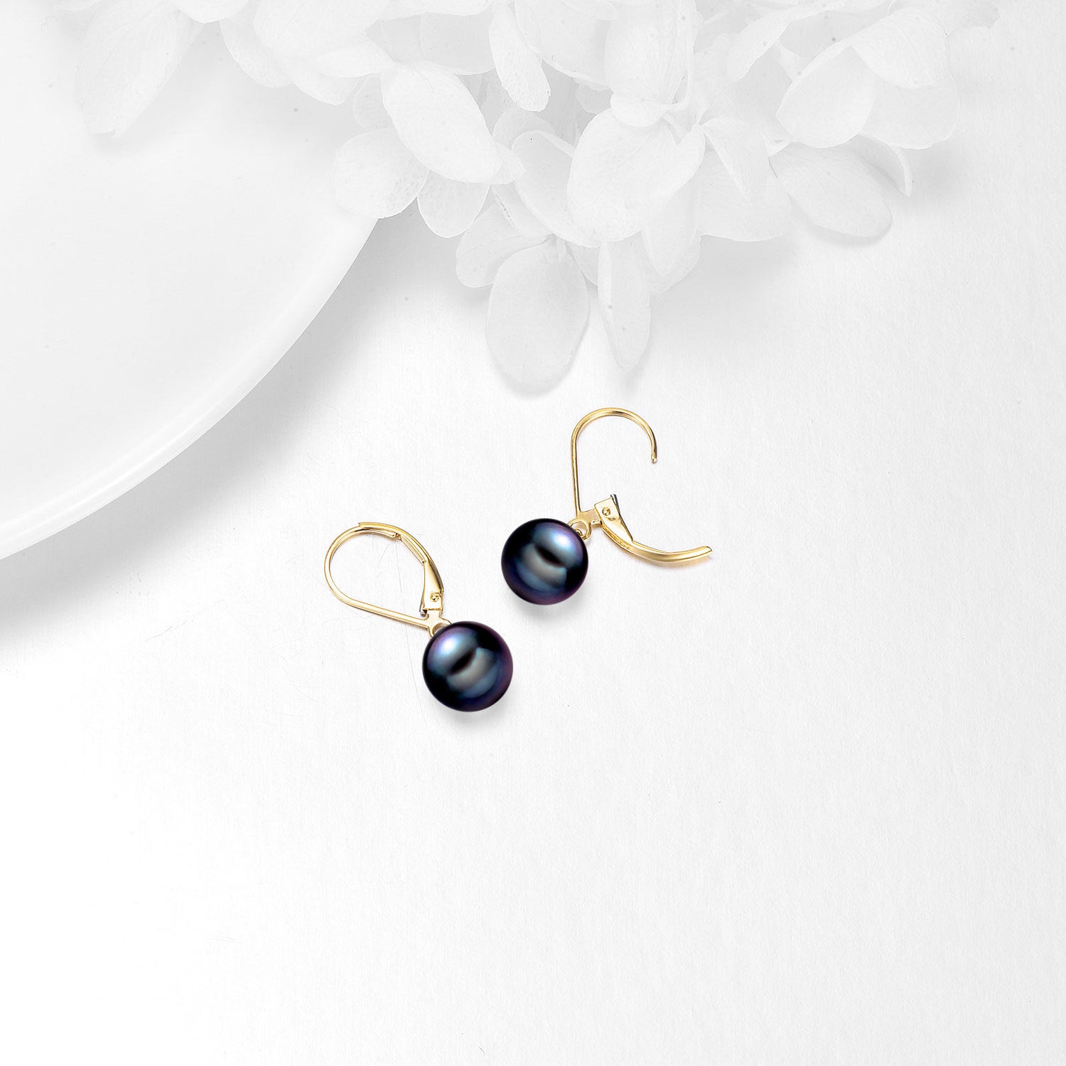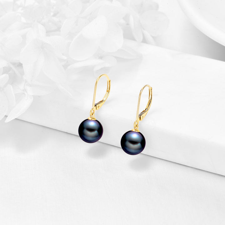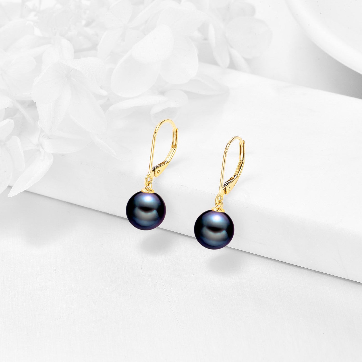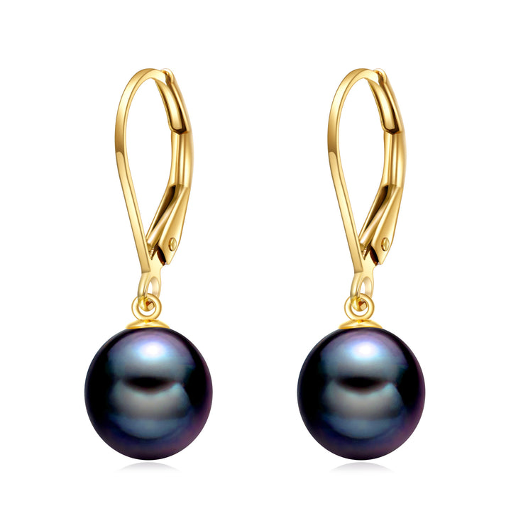 These lever-back earrings are crafted from Solid 14K Gold and feature a circular design set with lustrous black Pearl Beads.
