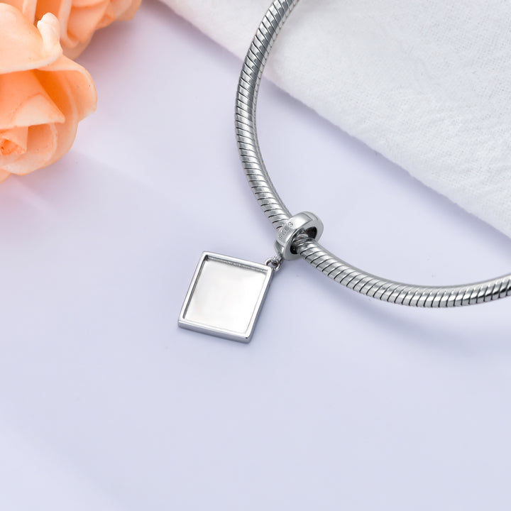 Crafted from Sterling Silver with White Gold Plating, this no-stone Dangle Charm features a customizable Photo Feature.