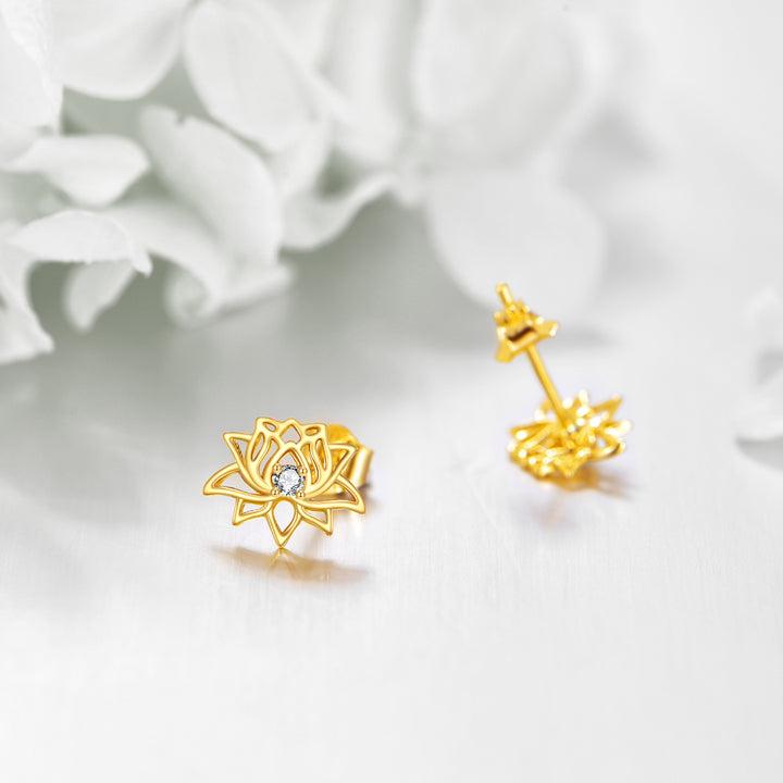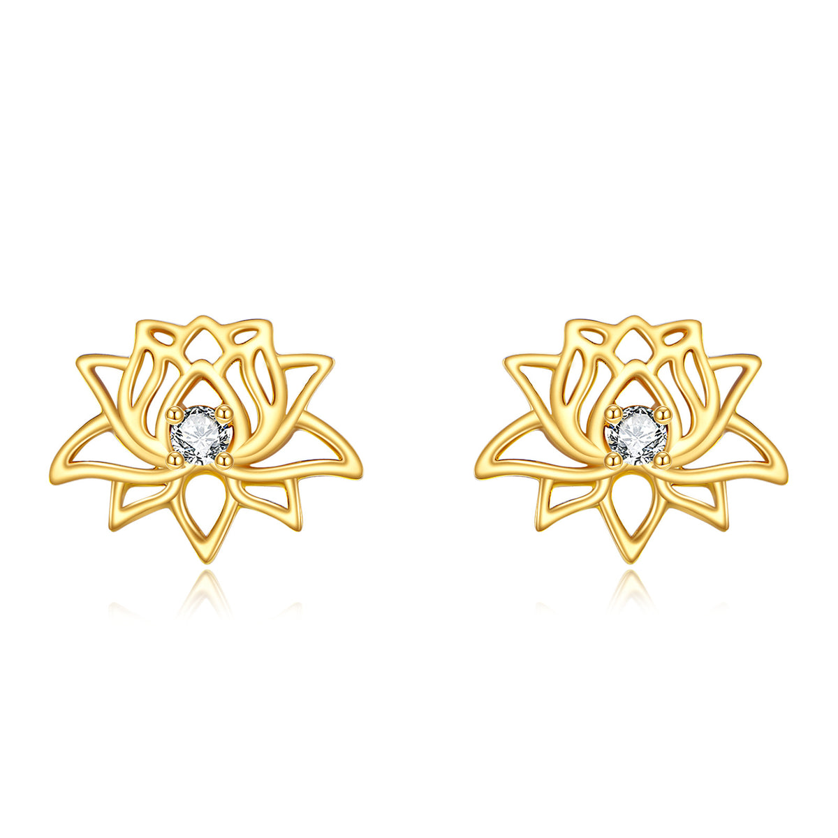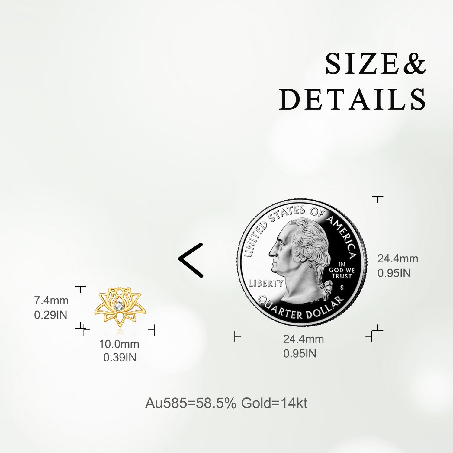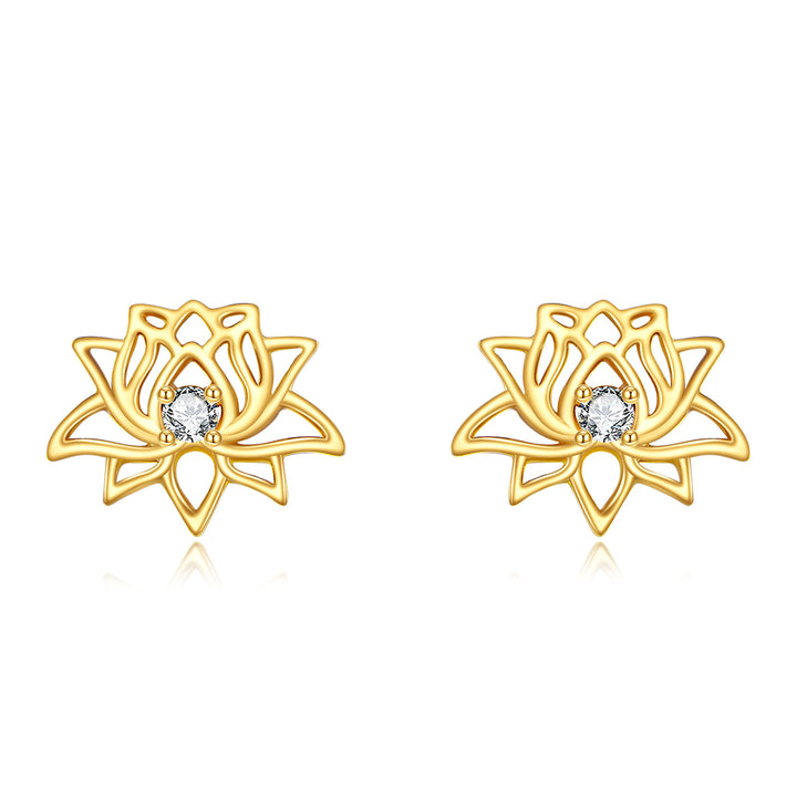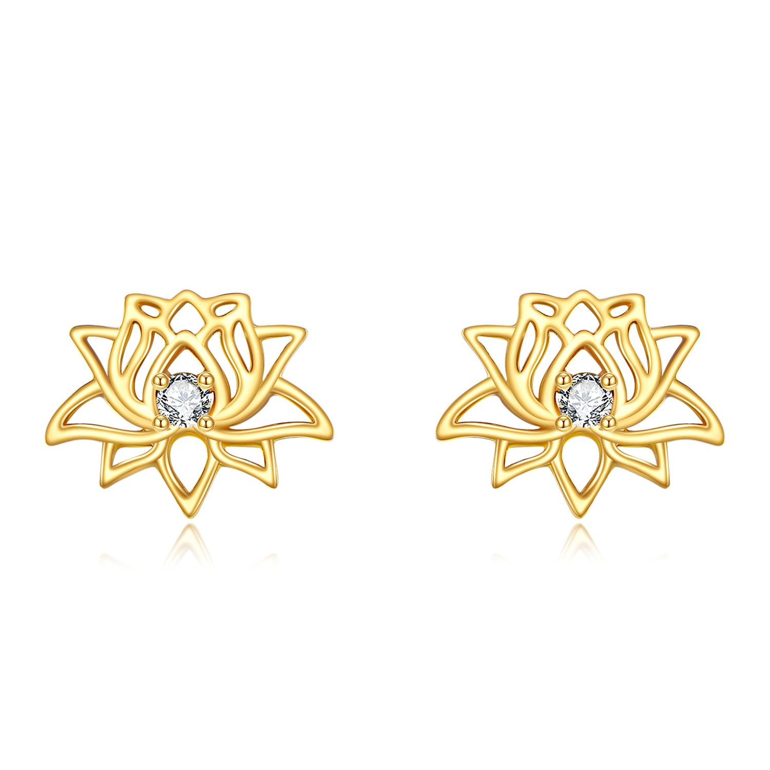 14K gold. Moissanite stones. Lotus-shaped stud design. Hypoallergenic.