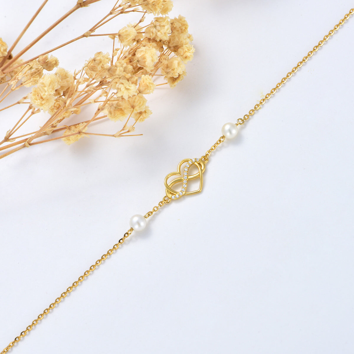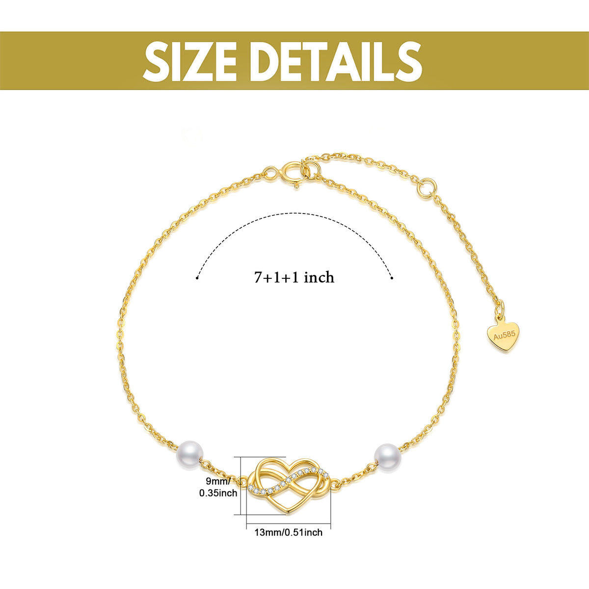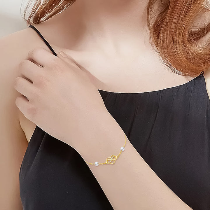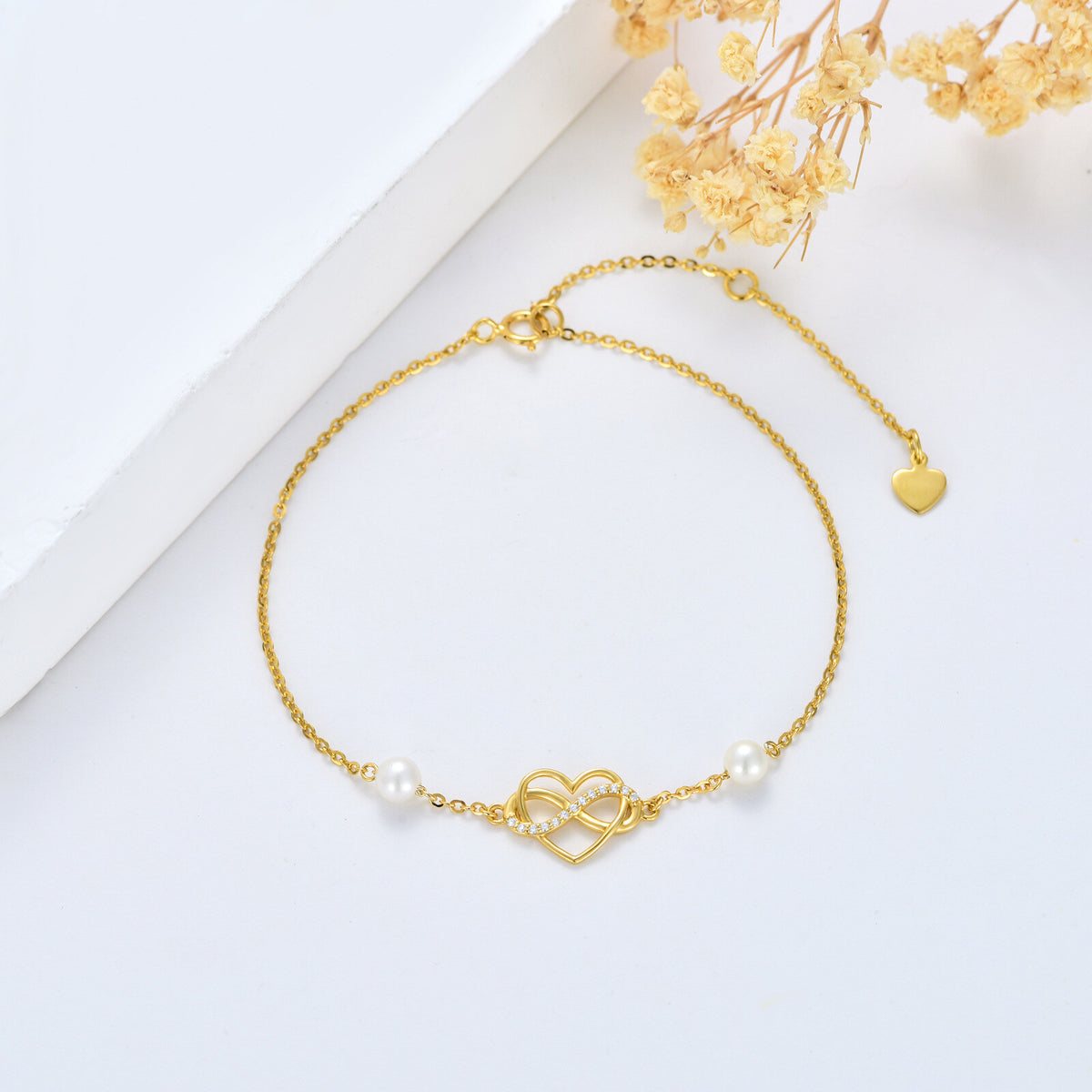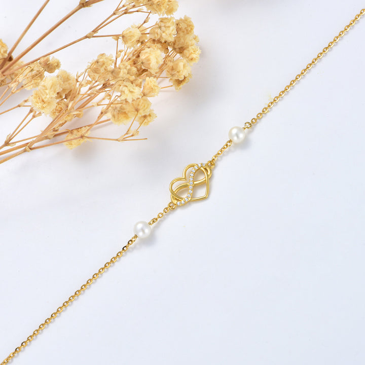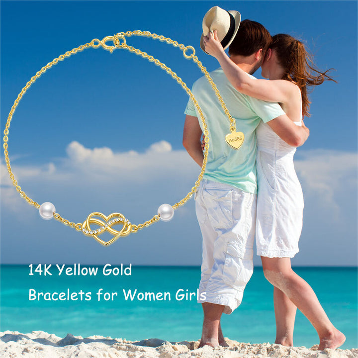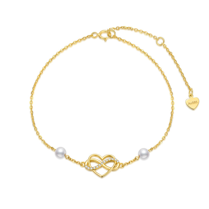 14K Gold Pearl With Cubic Zirconia Heart Infinity Symbol Charm Bracelet For Women