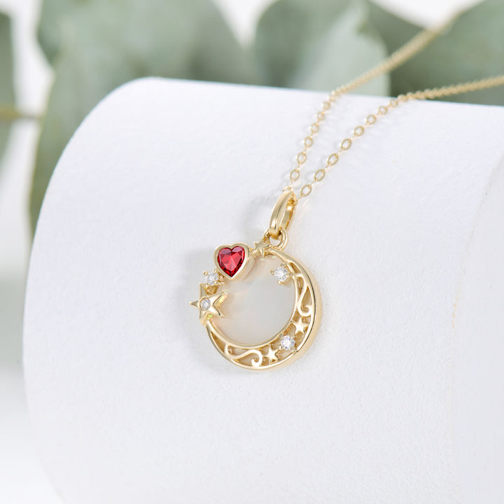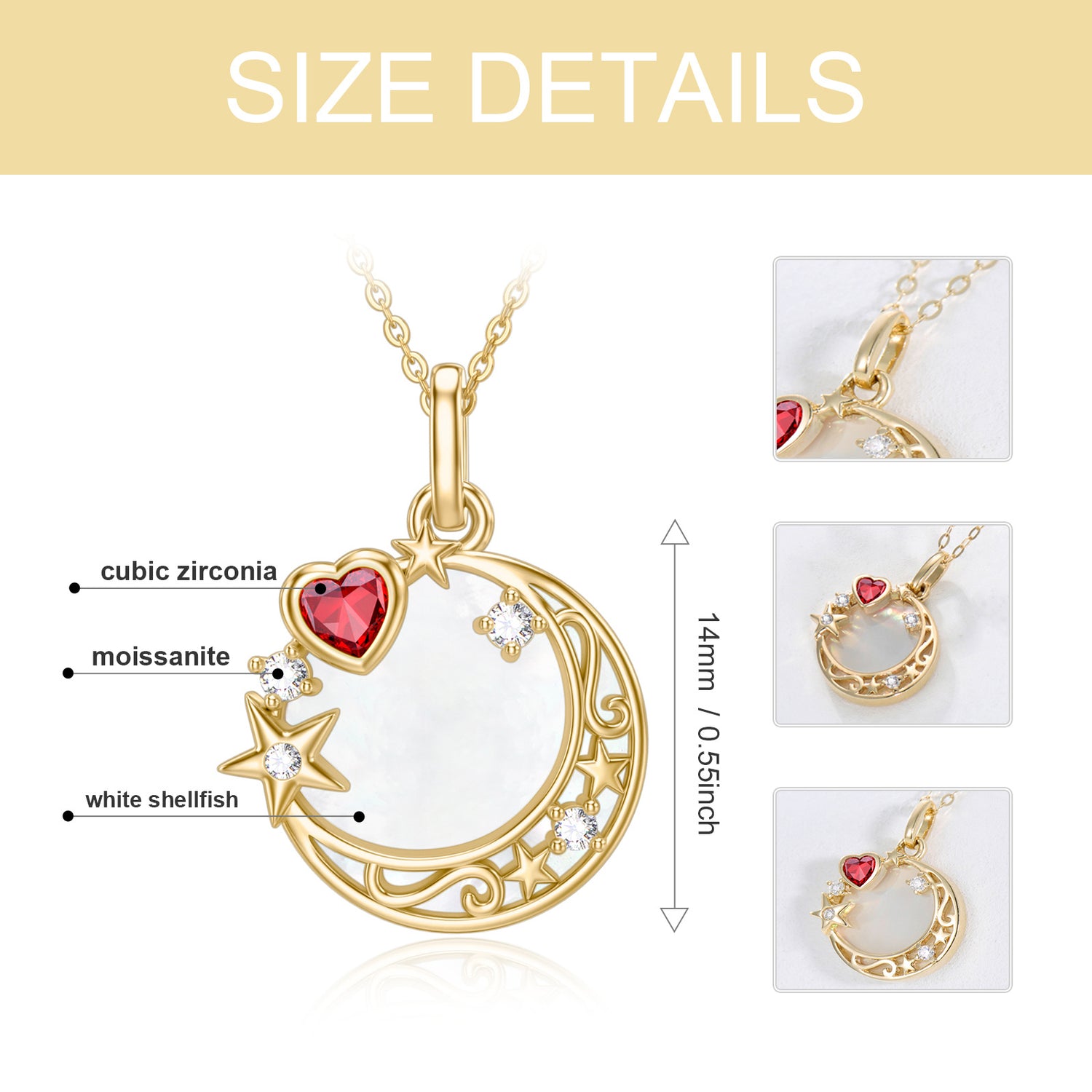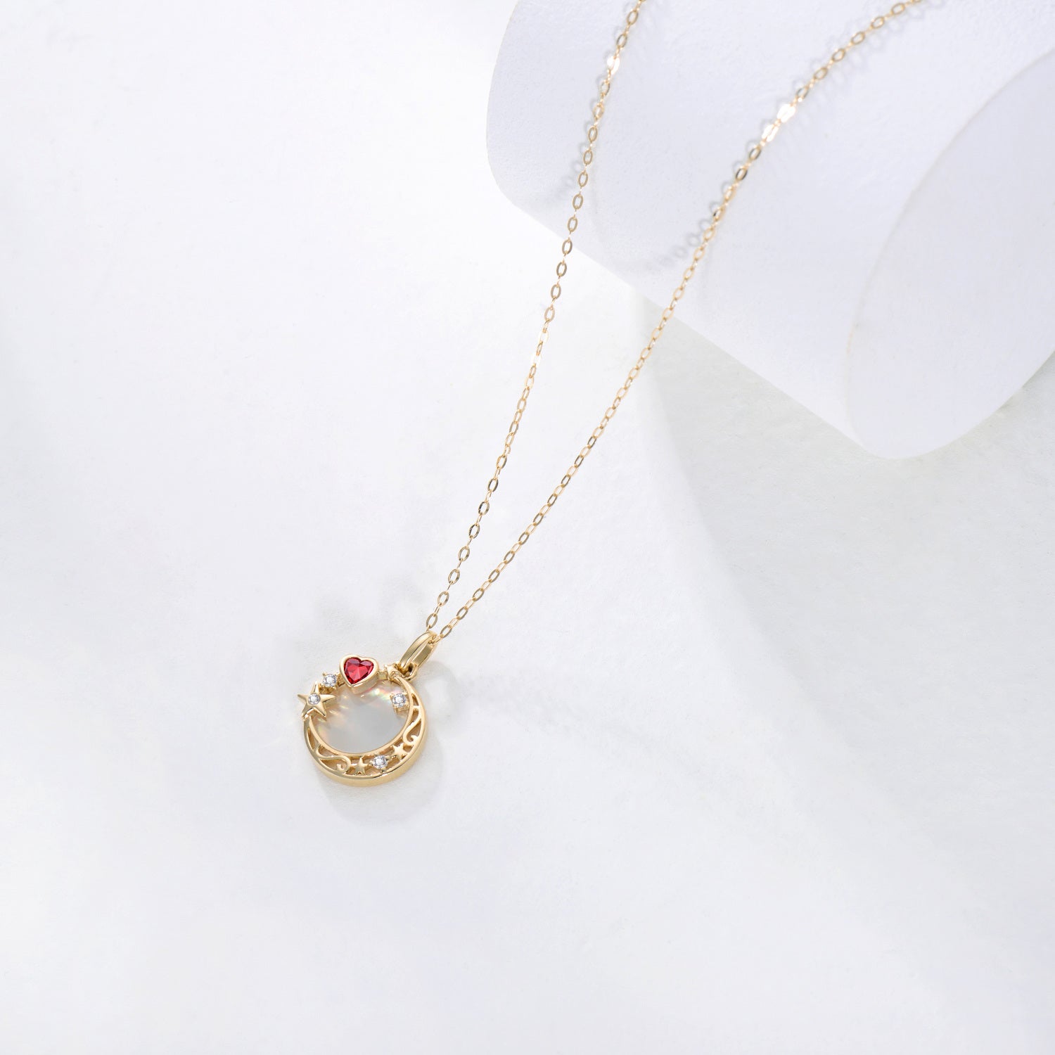 14K gold; cubic zirconia; Celtic knot and moon pendant; gold chain.