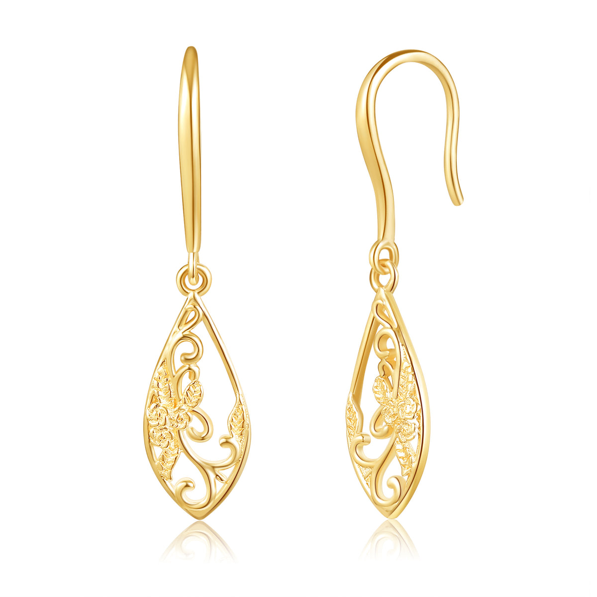 Crafted in 14K gold with detailed filigree workmanship. Lightweight drop design. No stones. Standard earring posts.