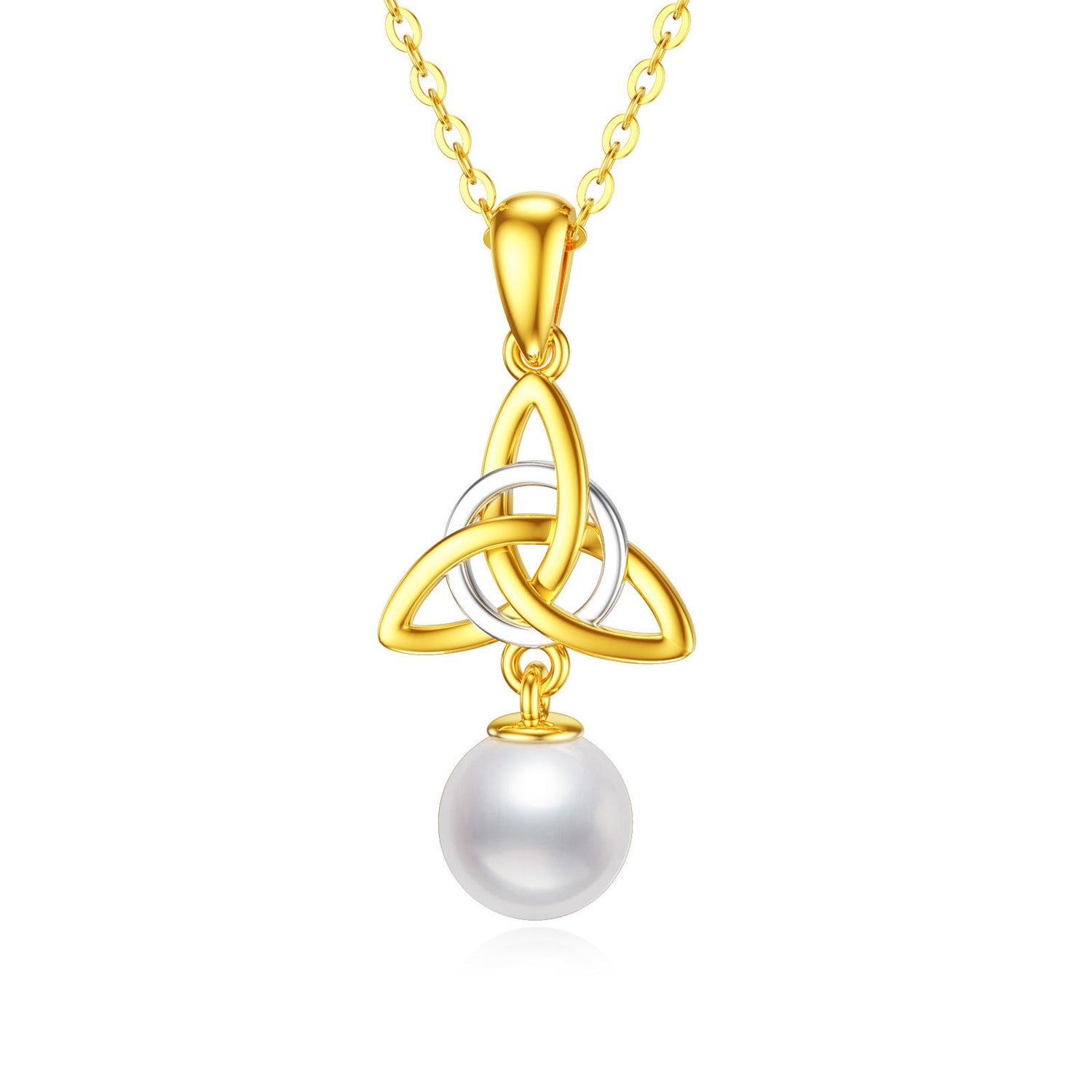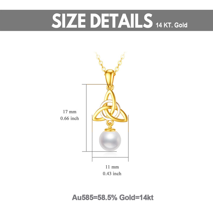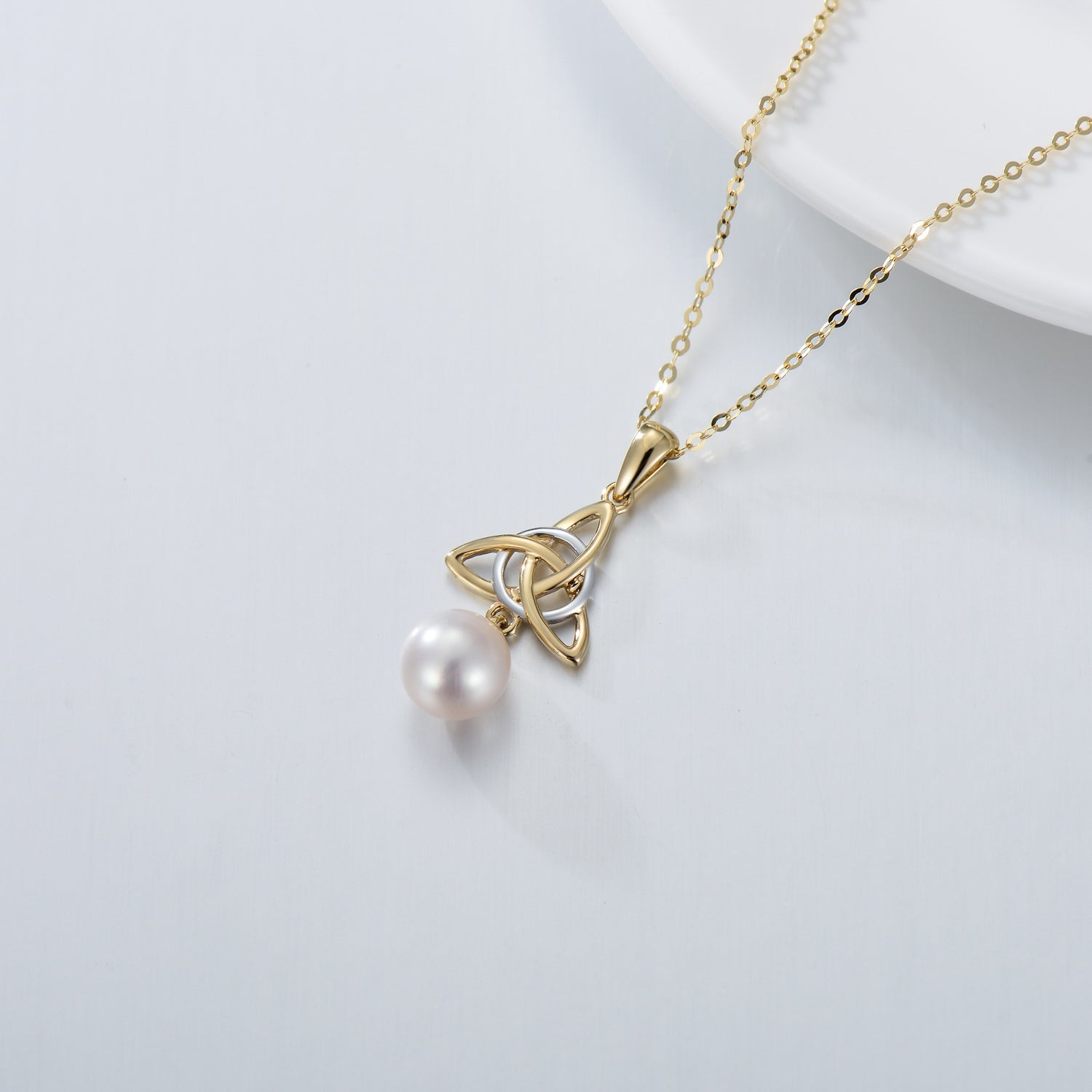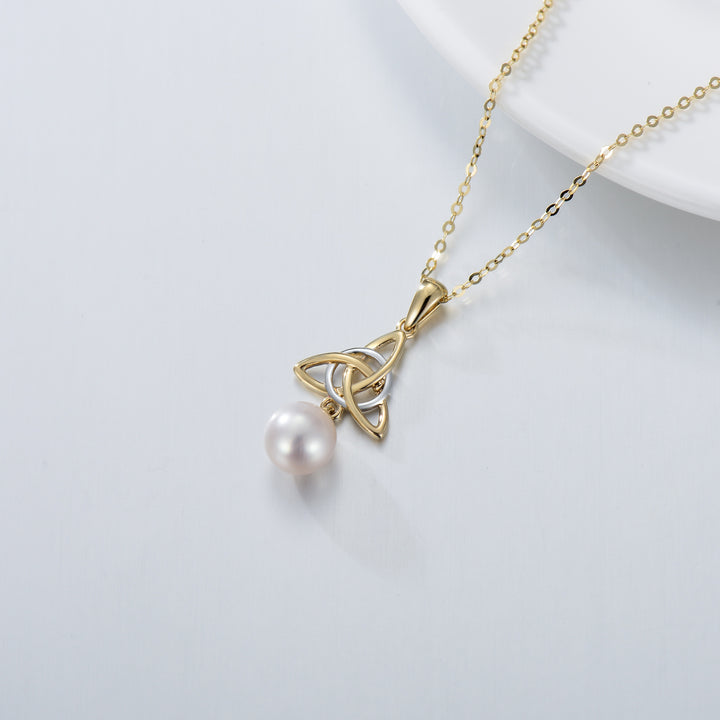 This circular pendant necklace is crafted from 14K solid gold (available in white gold or yellow gold) with a two-tone option. It features a delicate pearl and an intricate Celtic Knot motif.
