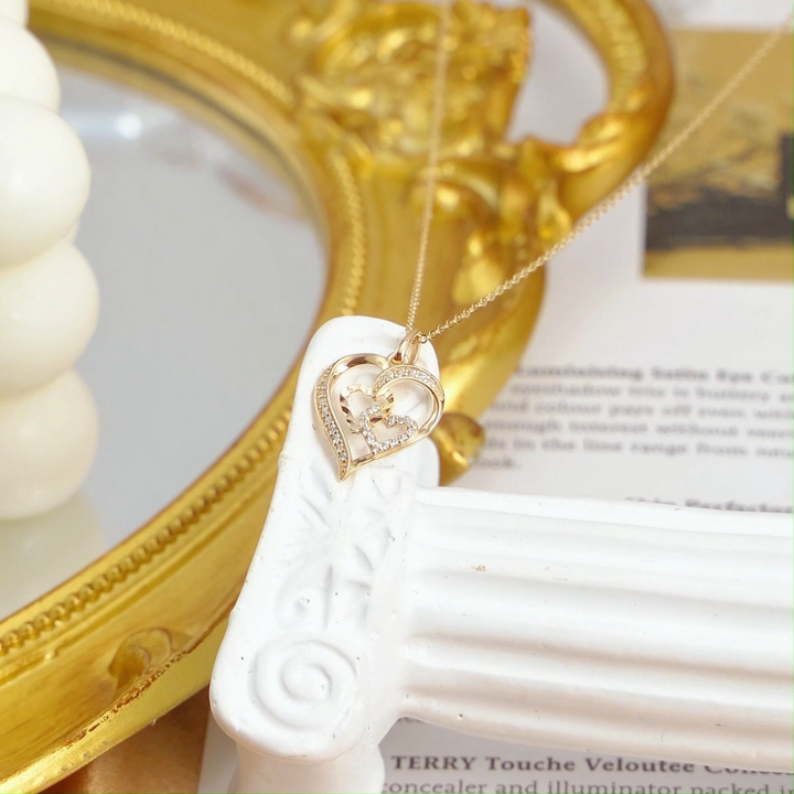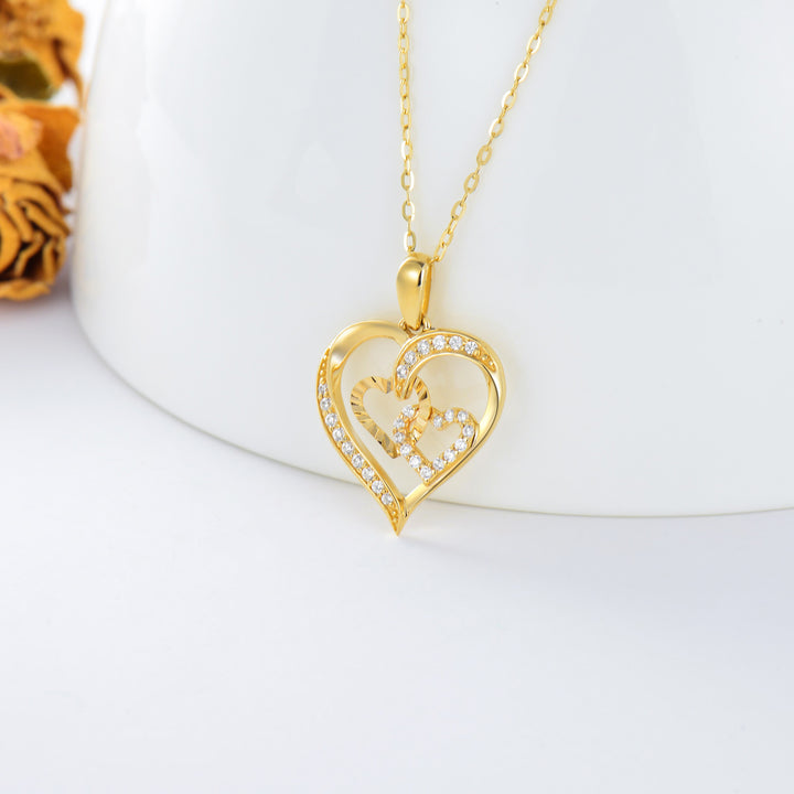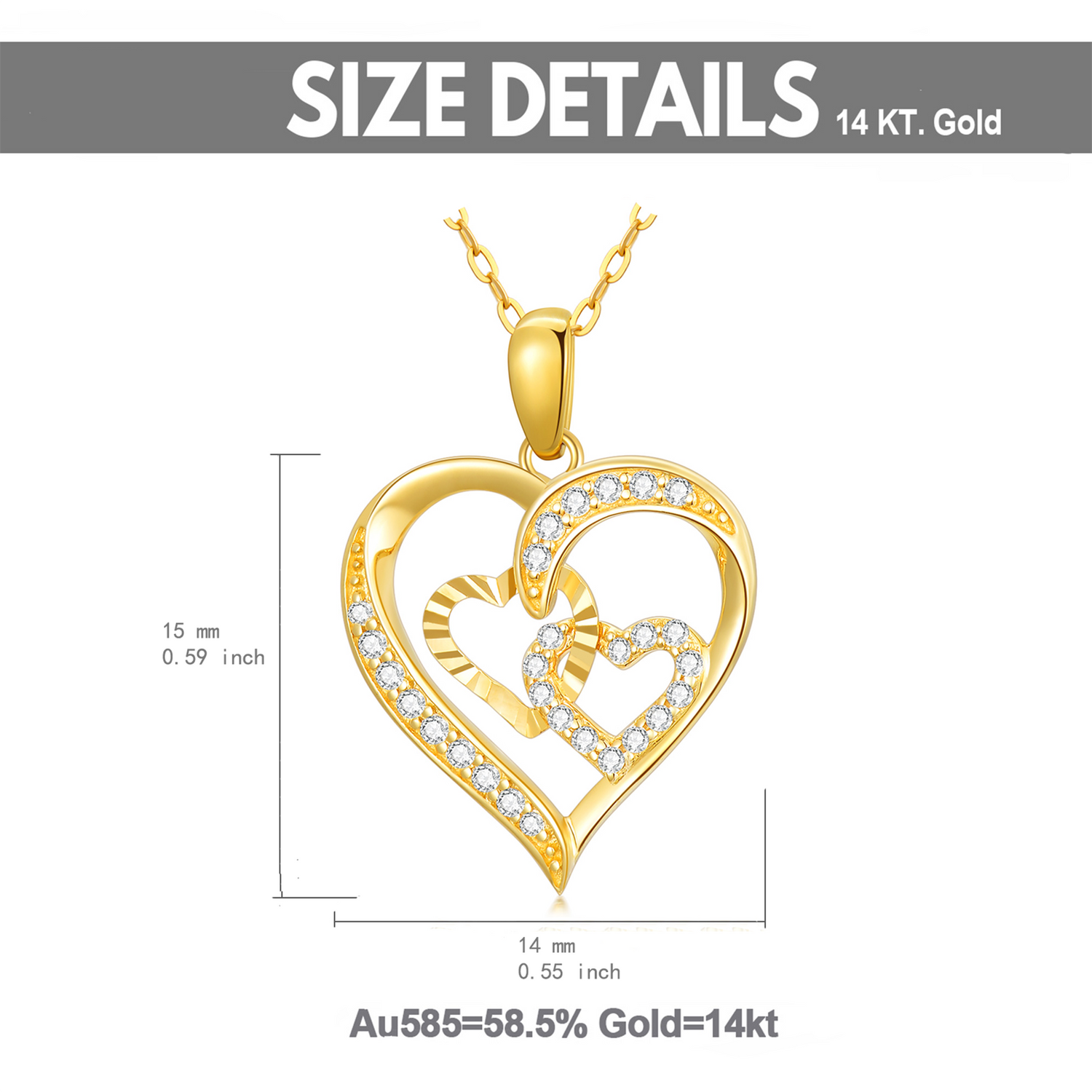 This Interlocking Hearts Pendant Necklace is crafted from 14K Gold, Featuring a Heart With Heart Motif Adorned with Dazzling Cubic Zirconia.