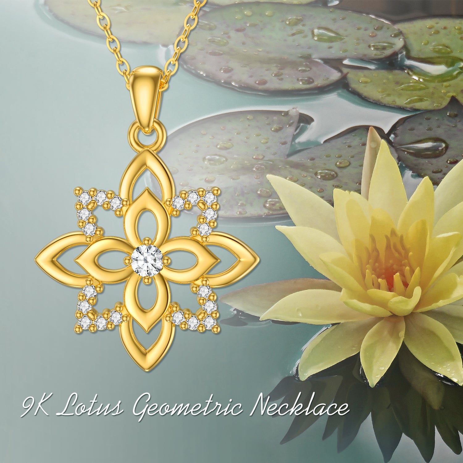 9K Gold Cubic Zirconia Four Leaf Clover & Lotus Pendant Necklace