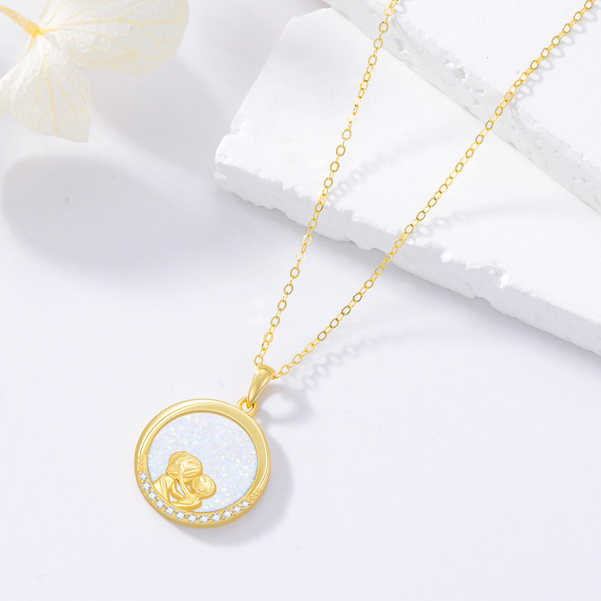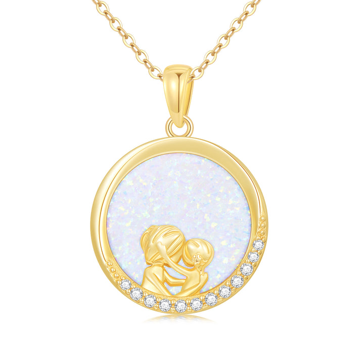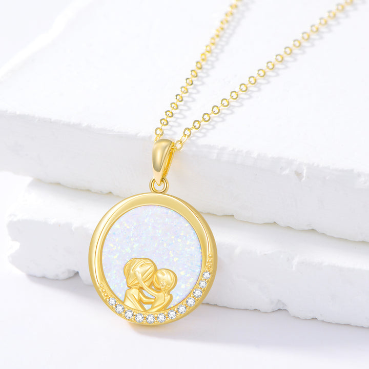 This Women's Round Pendant Necklace is crafted from 14K Gold, Featuring Sparkling Cubic Zirconia and Enchanting Opal, Designed for Mother and Daughter.