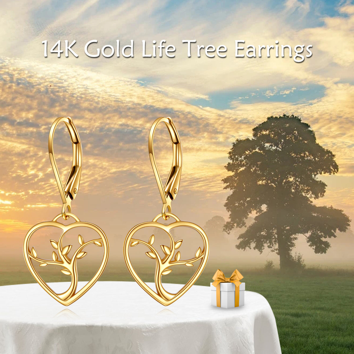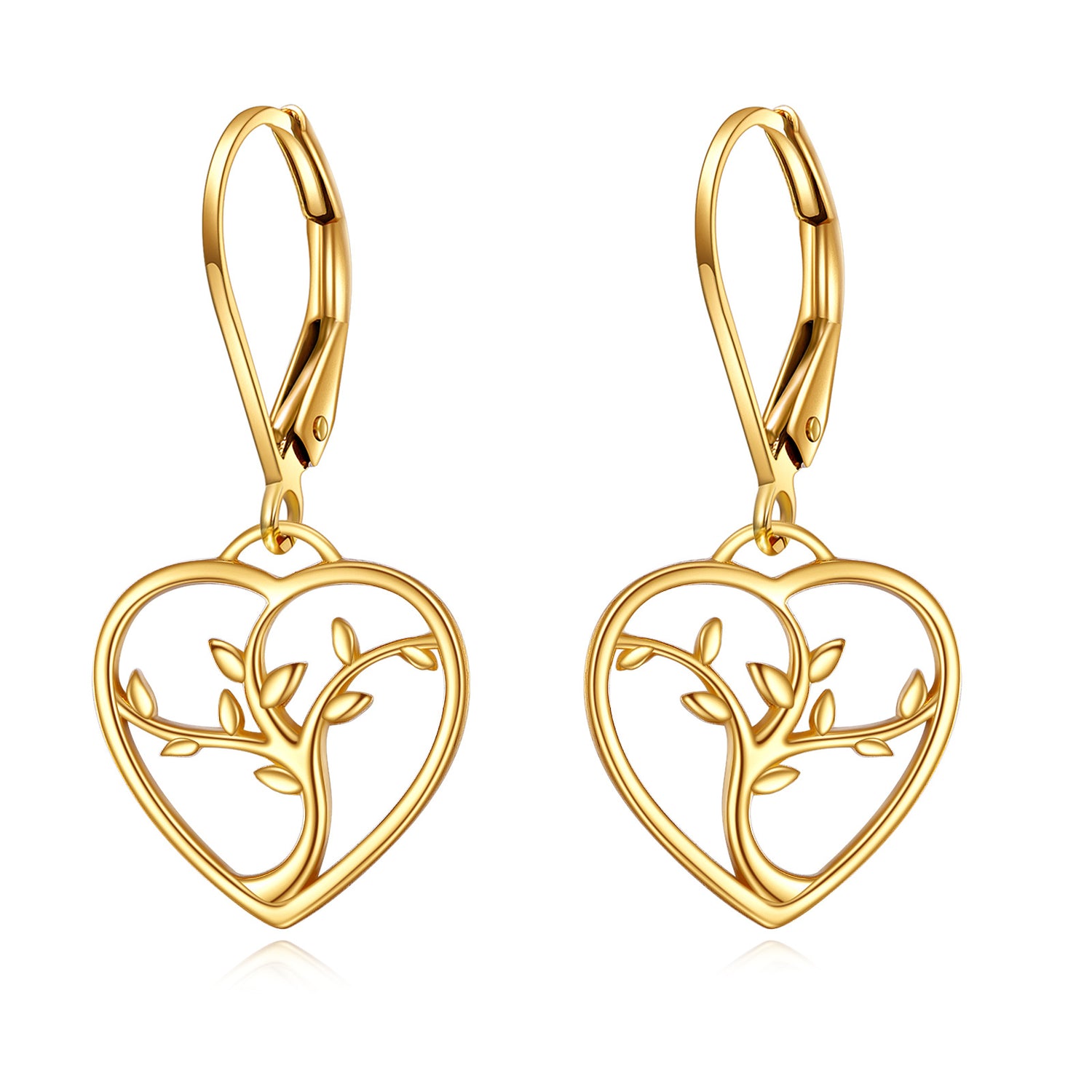 These no-stone Women's Drop Earrings are Crafted from 14K Gold, Featuring a Tree of Life Motif Encased within a Heart.