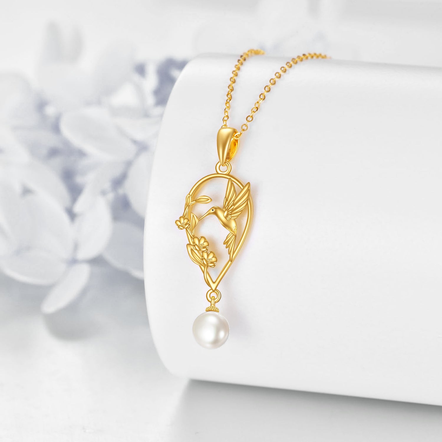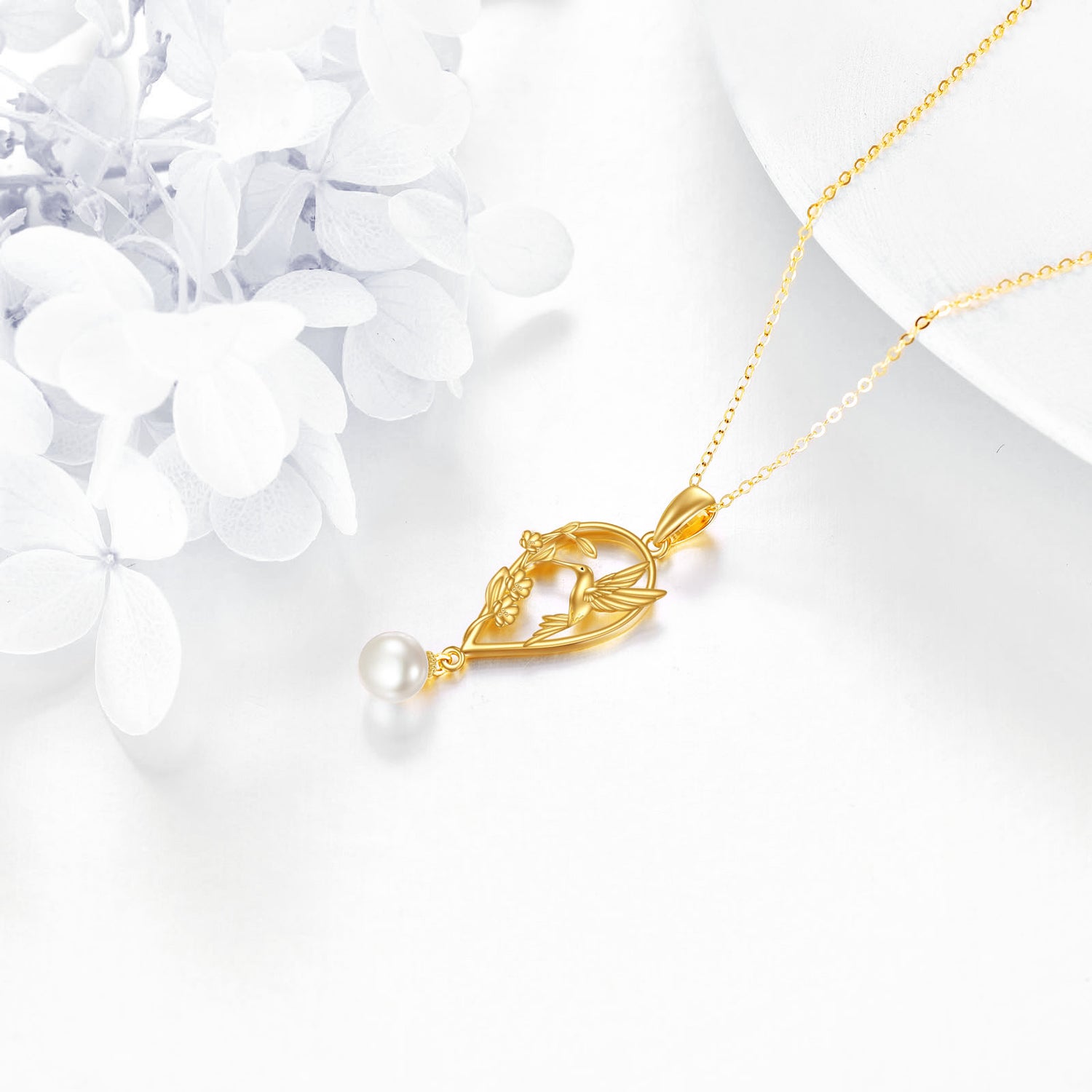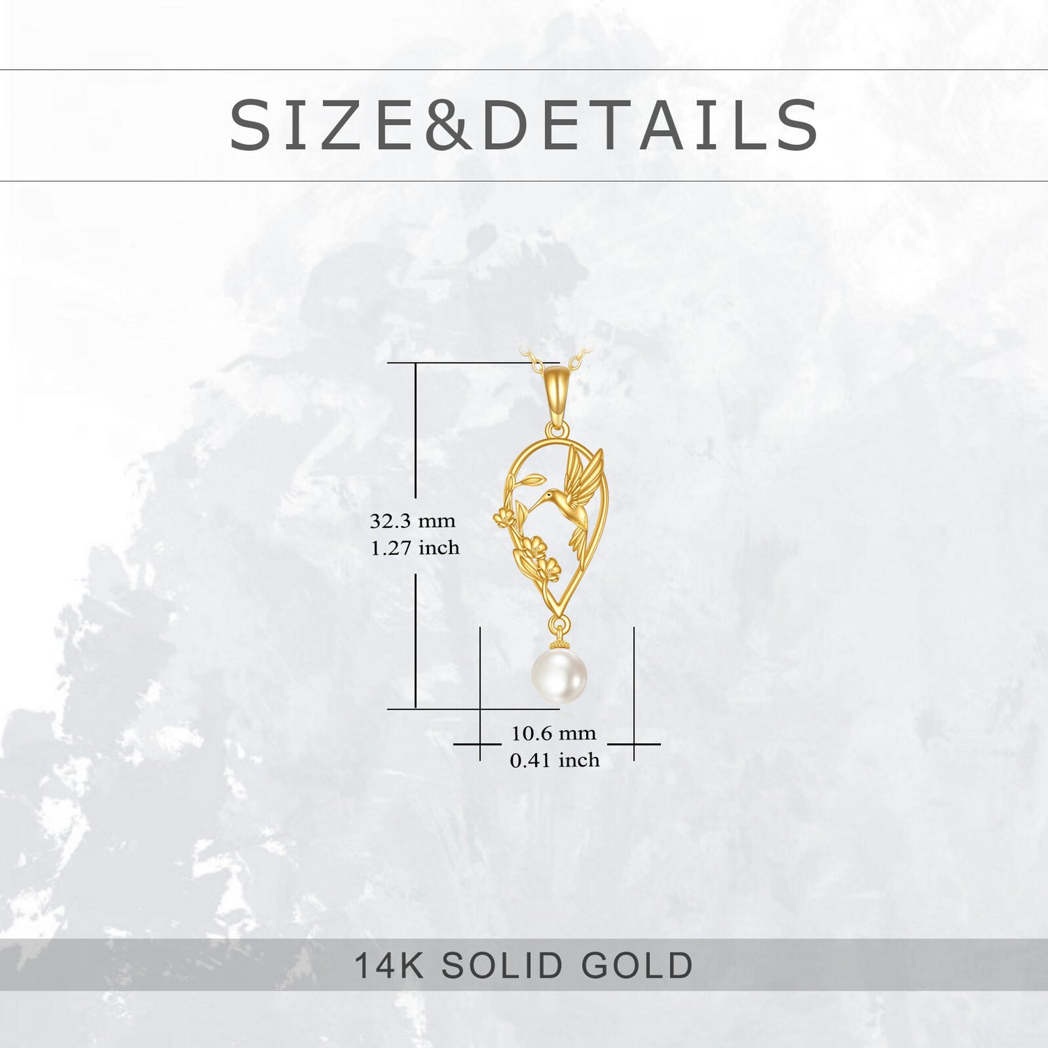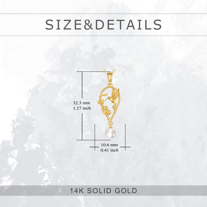 14K Gold Pearl Hummingbird & Wildflowers Pendant Necklace