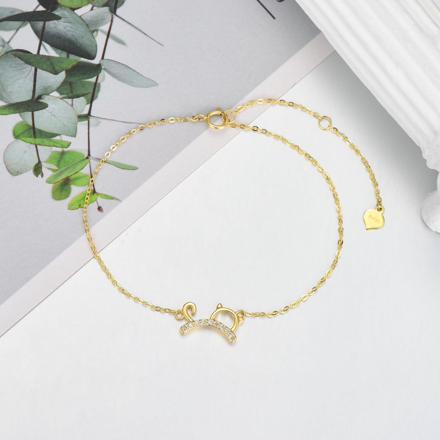 This 14K Gold Circular Shaped Diamond Cat Charm Bracelet by YFN is a delightful blend of charm and sophistication for women. This stunning 14K gold charm bracelet features a circular-shaped, cat-themed charm embedded with sparkling white diamonds, ensuring a standout accessory.