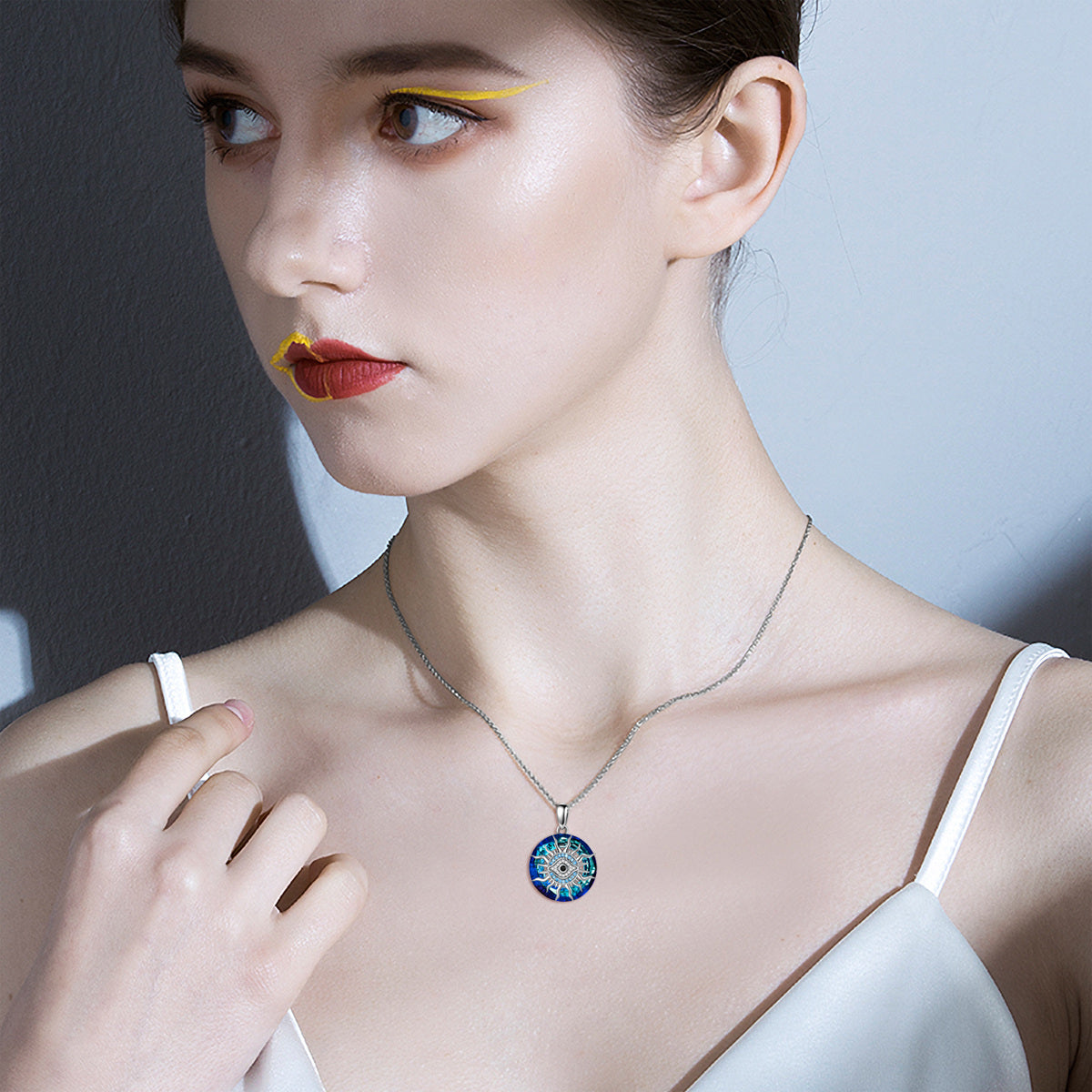 This Sterling Silver Circular Shaped Evil Eye & Sun Crystal Pendant Necklace by YFN offers an exquisite blend of elegance and mystique for women. This captivating White Gold Plated Crystal Pendant Necklace features a Circular Design with a stunning Blue Evil Eye in the center, surrounded by Sun Motifs, symbolizing protection and celestial beauty.