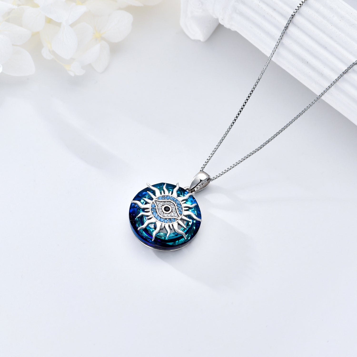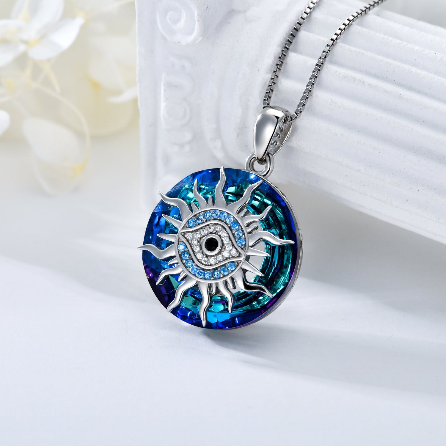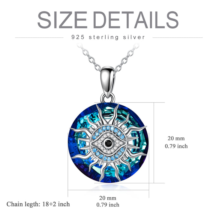 Crafted from high-quality Sterling Silver with White Gold Plating, this Circular Shaped Crystal Pendant Necklace features a Blue Evil Eye surrounded by Sun Motifs.