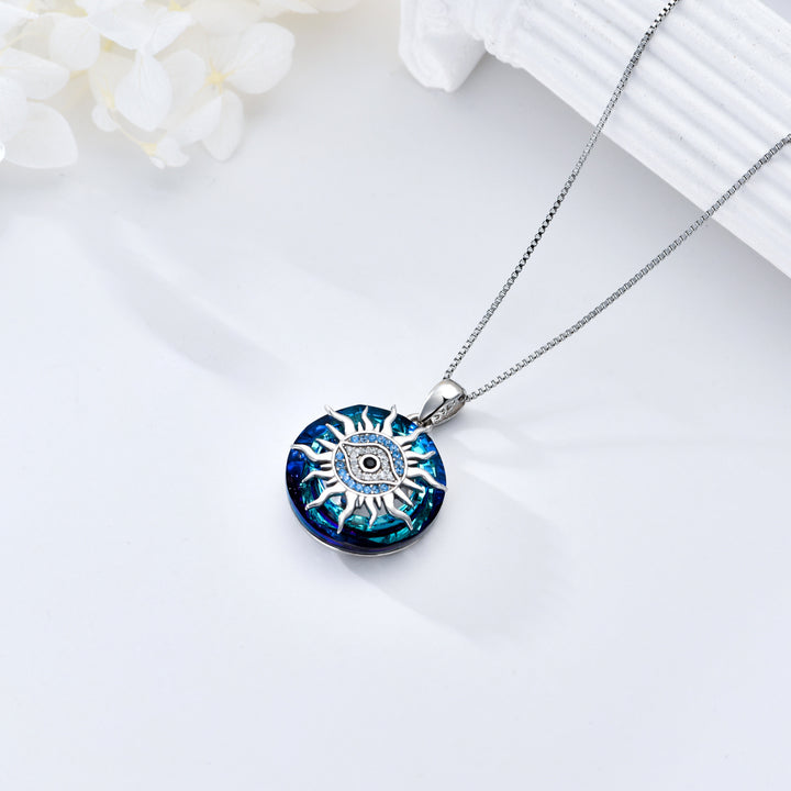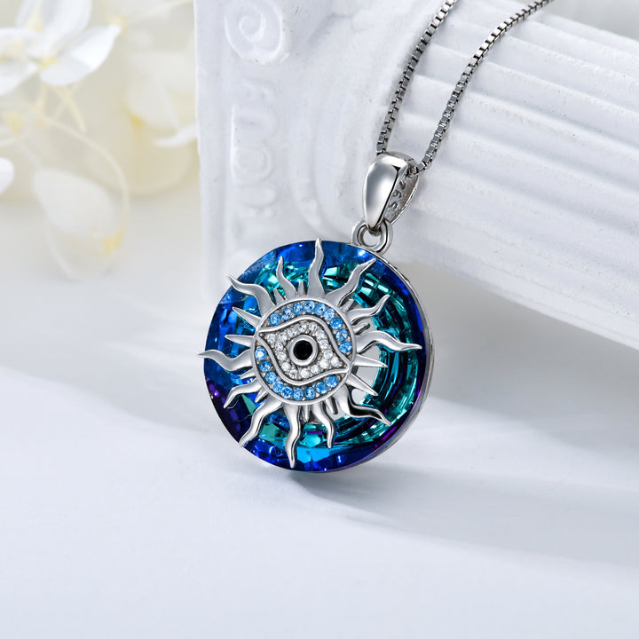 Sterling Silver Circular Shaped Evil Eye & Sun Crystal Pendant Necklace