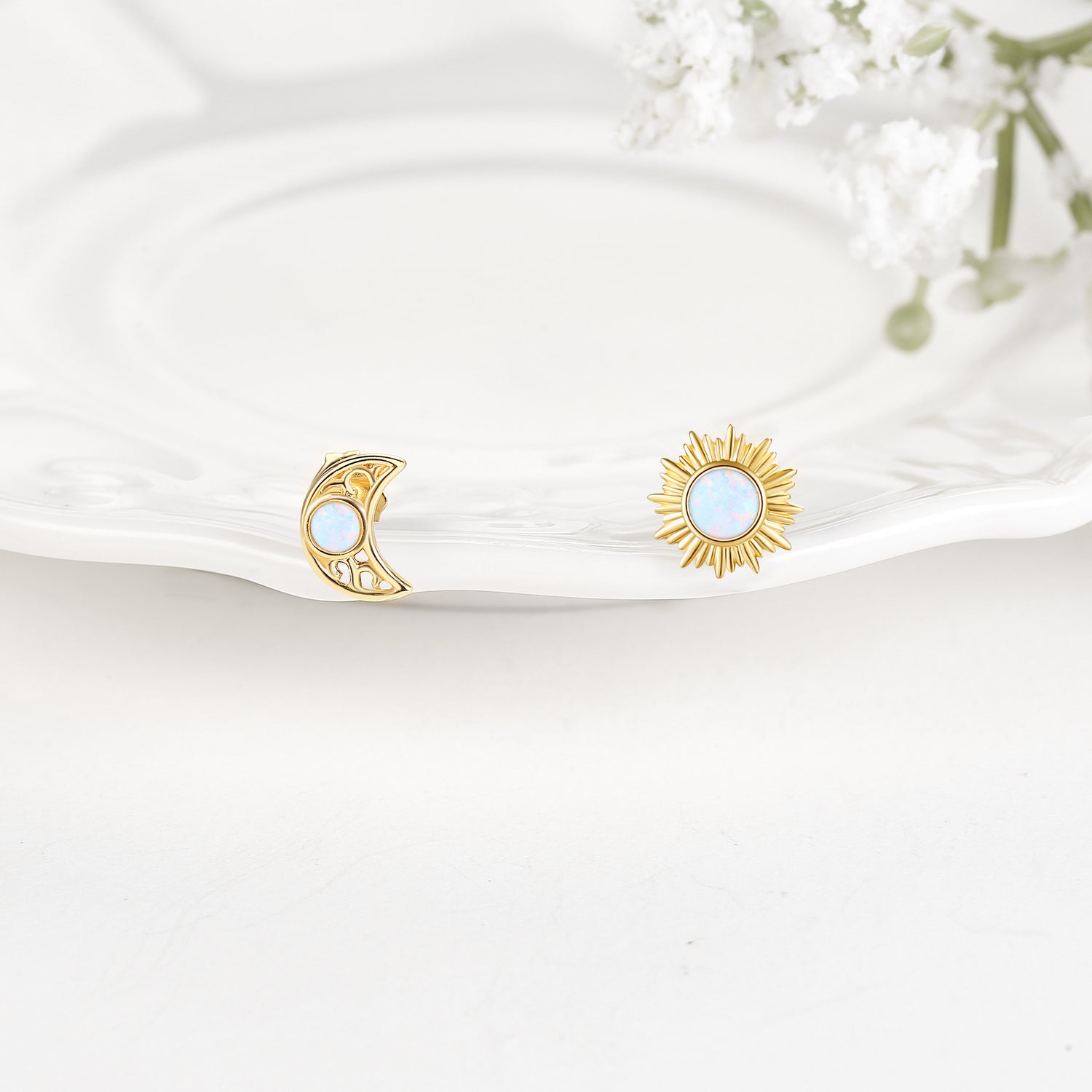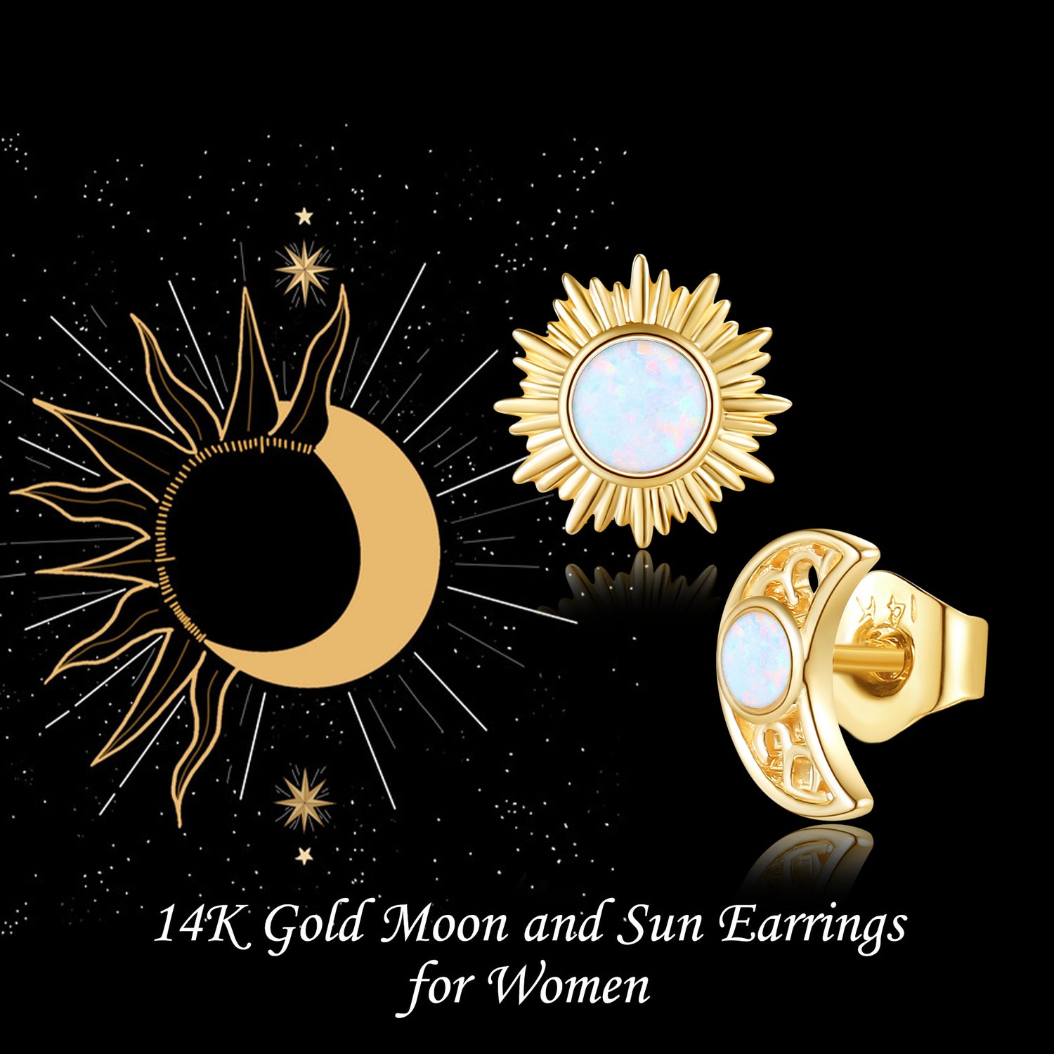 Crafted from 14K Gold, featuring Stud Earrings with Opal and Moon & Sun Motifs.