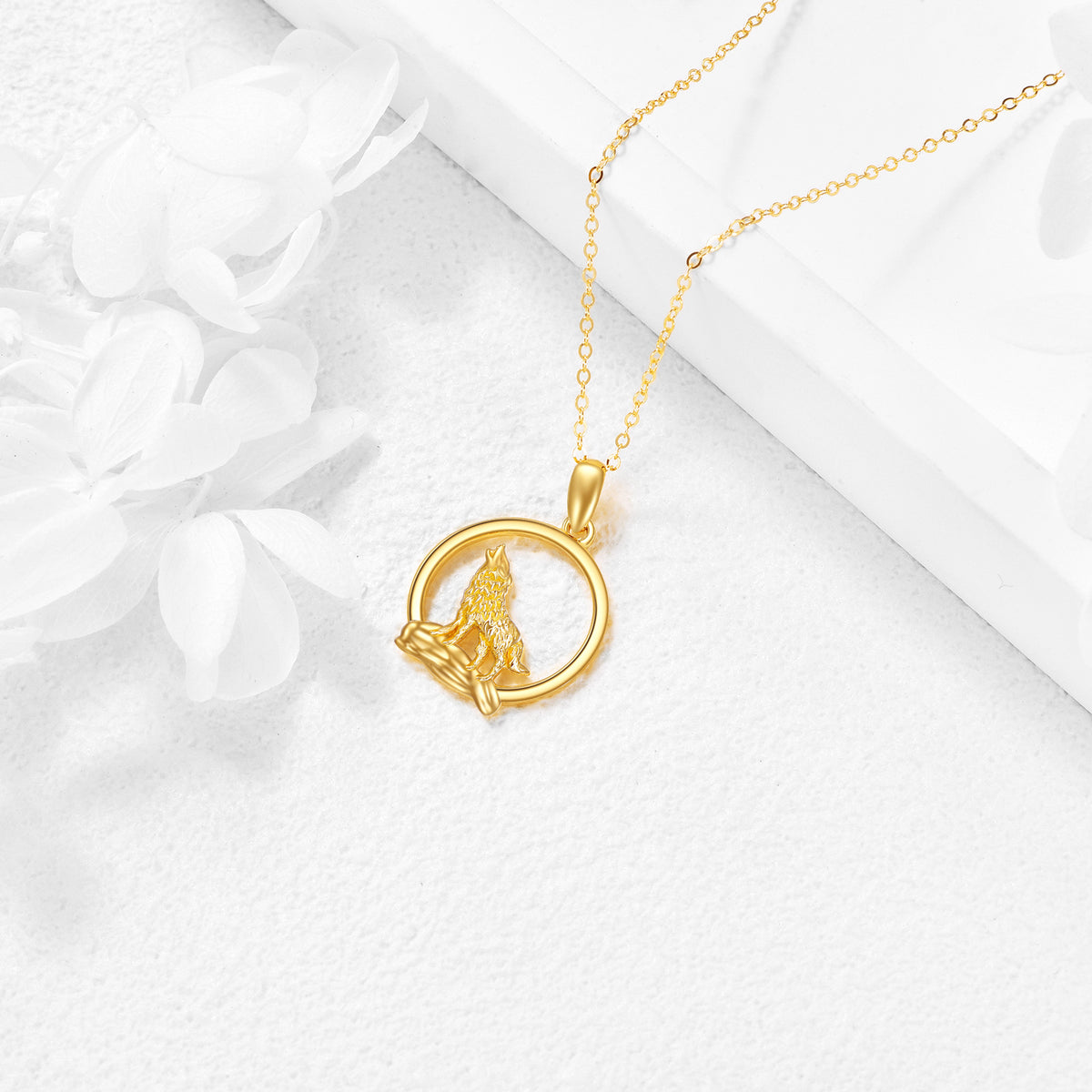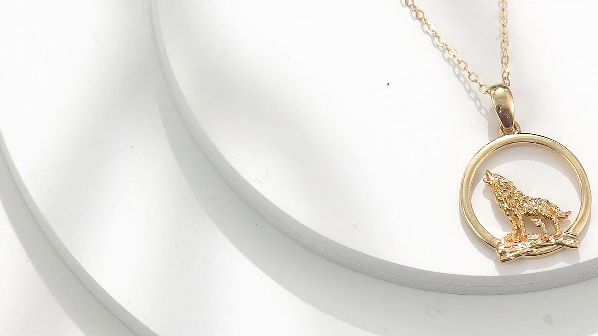 14K gold; wolf motif pendant; gold chain; stone-free design.