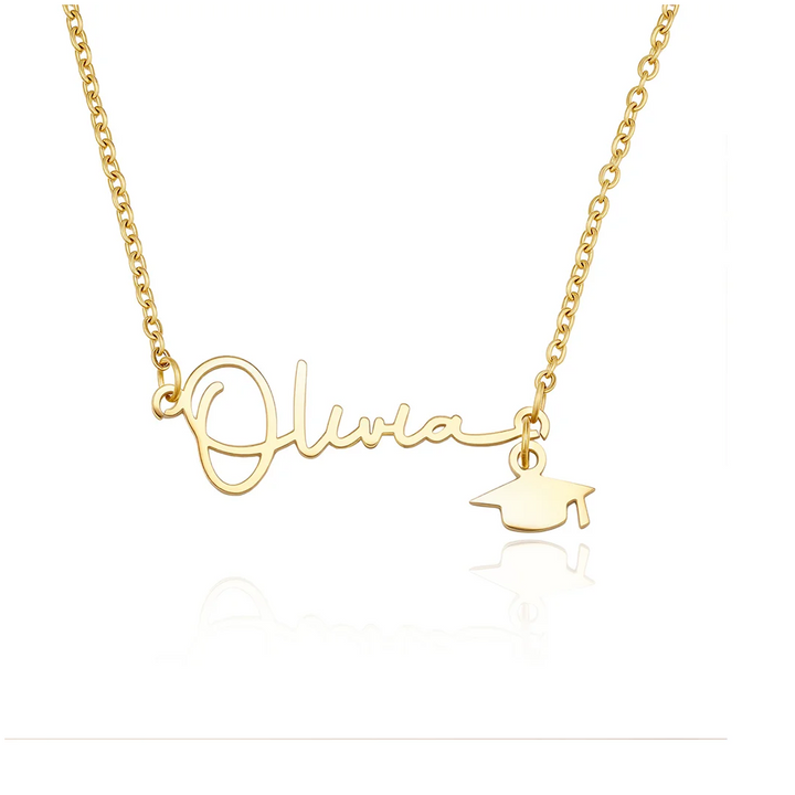 Crafted from 14K solid gold. Designed as a personalized name necklace. Features a graduation cap motif (Class of 2025). Unisex. Stone-free design.