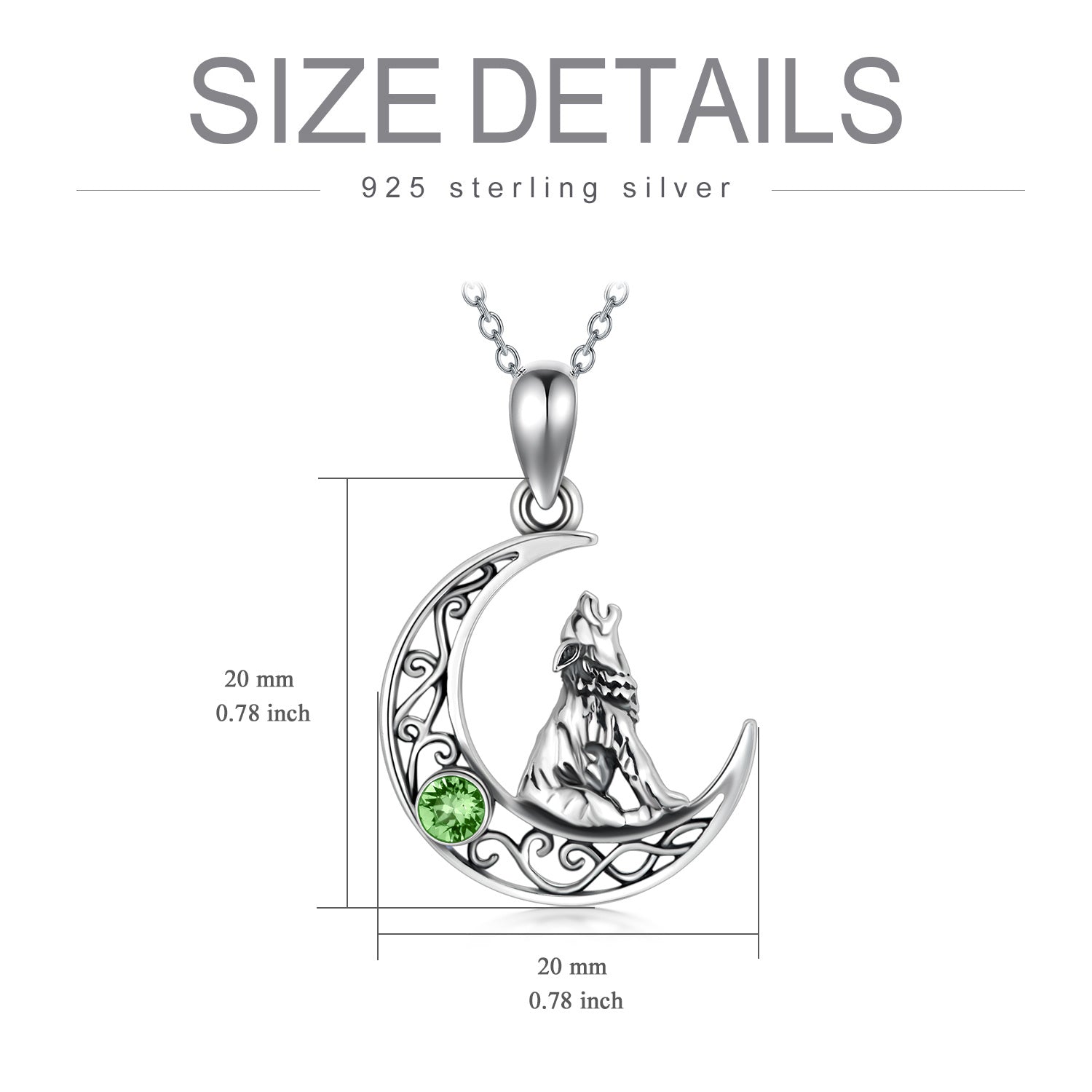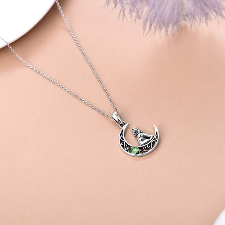 Sterling Silver Circular Shaped Crystal Wolf & Moon Pendant Necklace