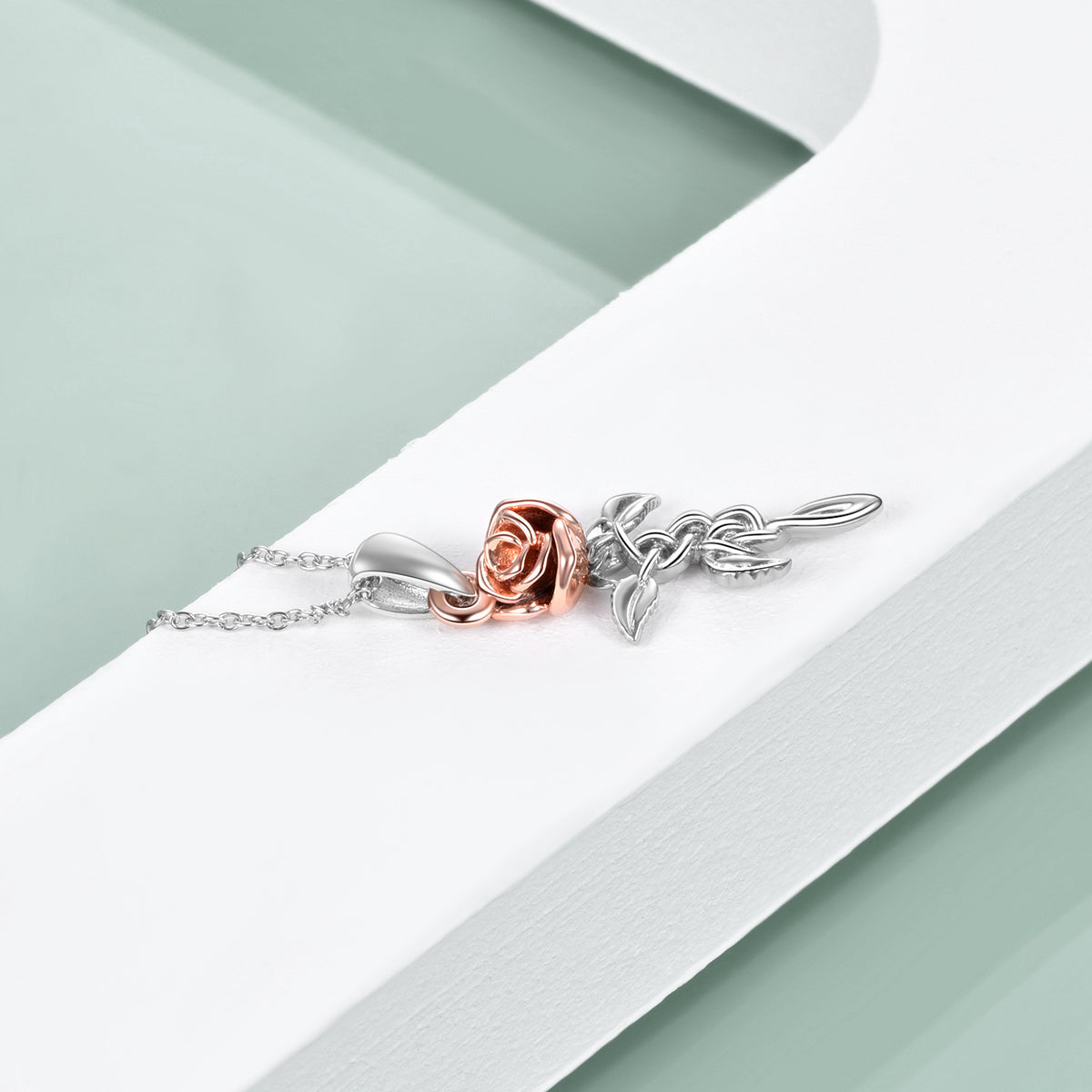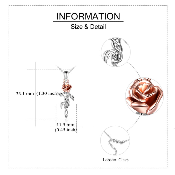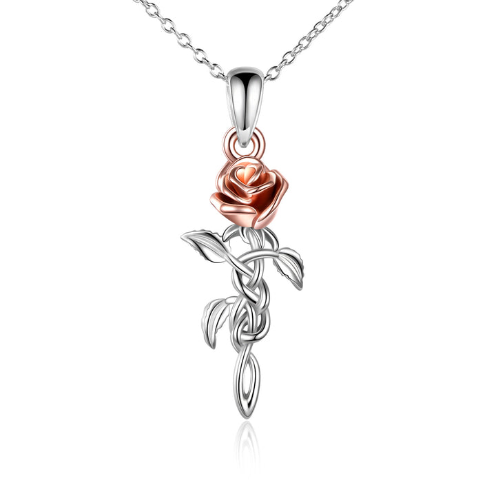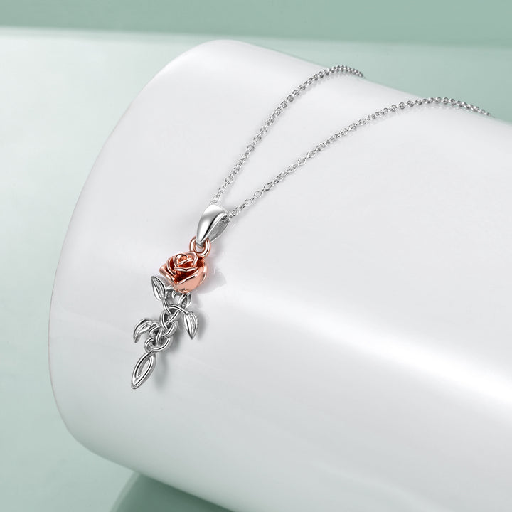 This no-stone Women's Pendant Necklace is crafted from Sterling Silver (Two-tone - Silver & Rose Gold), Featuring a Celtic Knot and Delicate Rose Branch Motif.