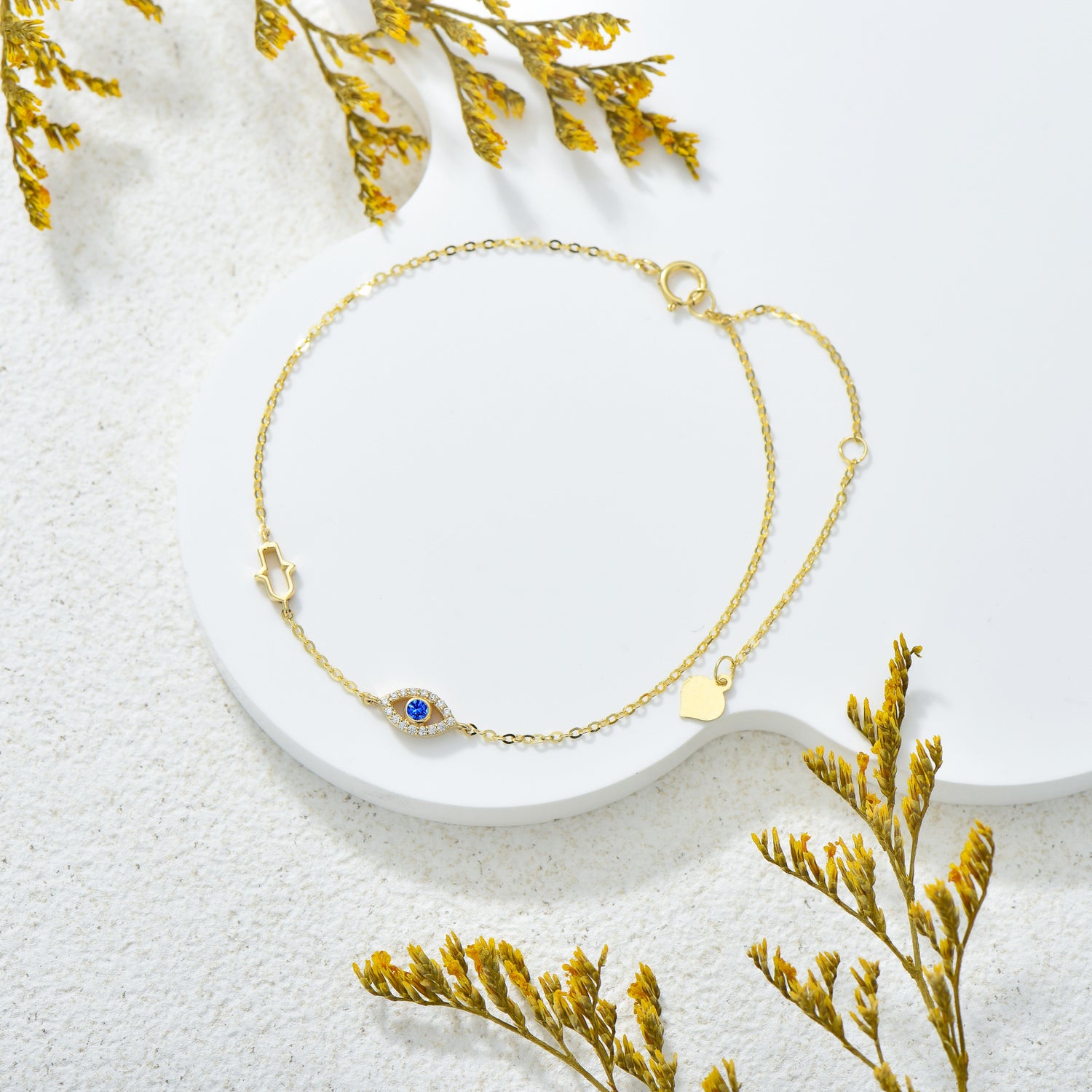 This 14K Gold Cubic Zirconia Evil Eye & Hamsa Hand Charm Bracelet by YFN beautifully merges spiritual symbolism with refined luxury. The blue cubic zirconia Evil Eye radiates brilliant sparkle while symbolizing protection and clarity, complemented by the intricately crafted Hamsa Hand known for blessings and good fortune. Set along a luminous 14K gold chain, this bracelet offers elegance and everyday versatility, ideal for women who embrace meaningful adornments. Whether worn alone or layered, it adds a sophisticated touch infused with cultural charm and positive energy.