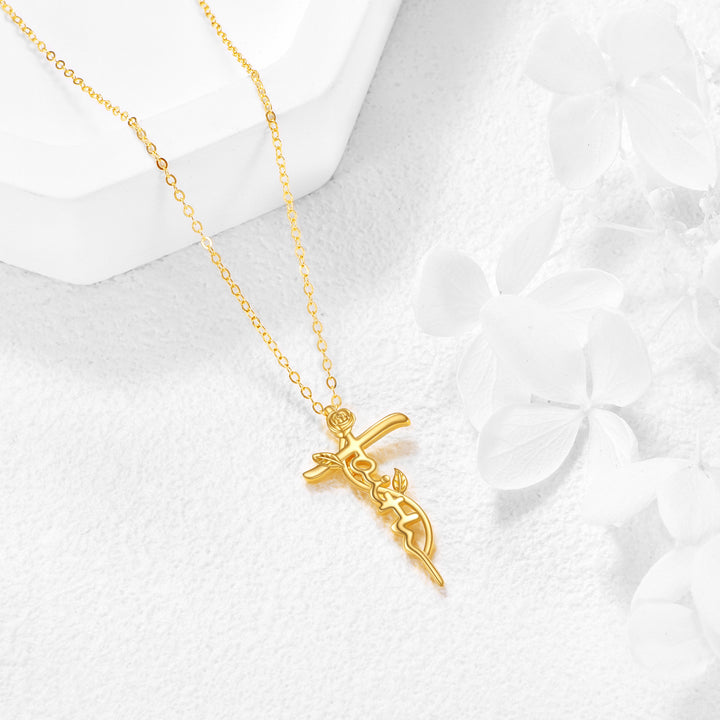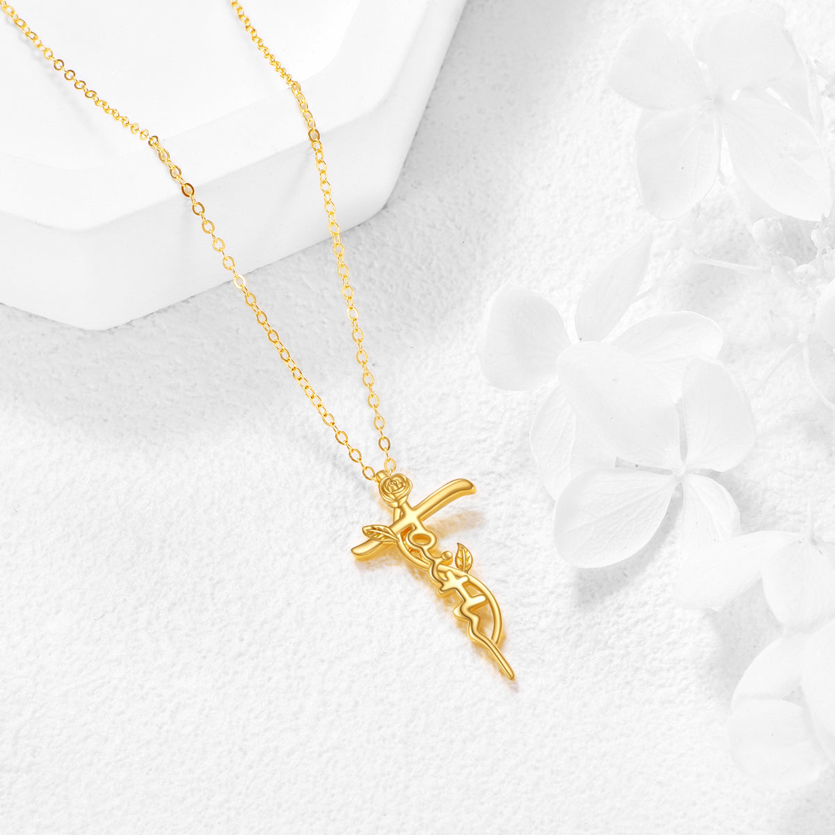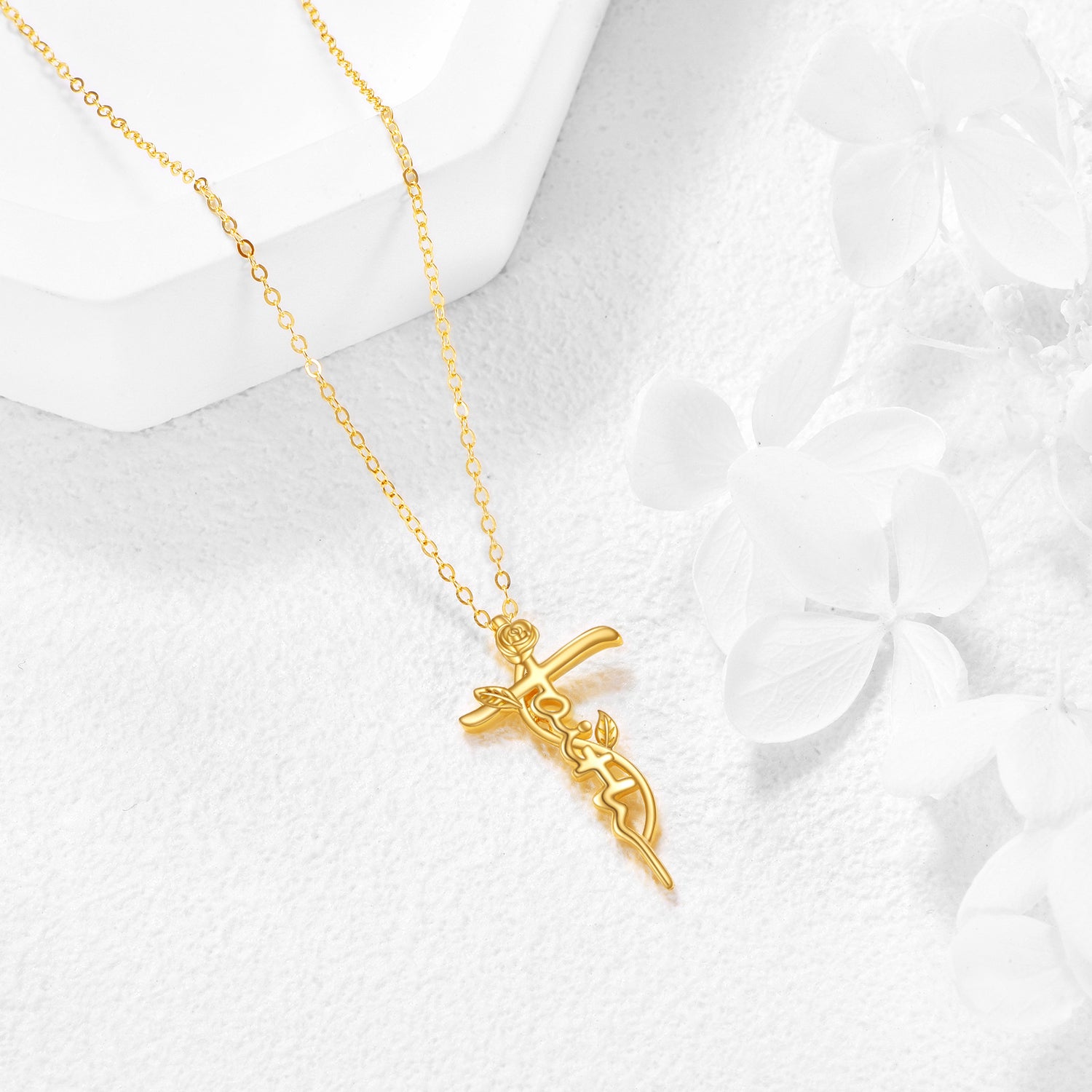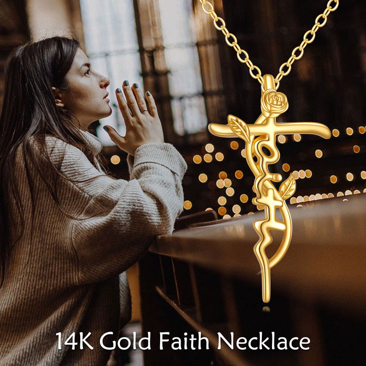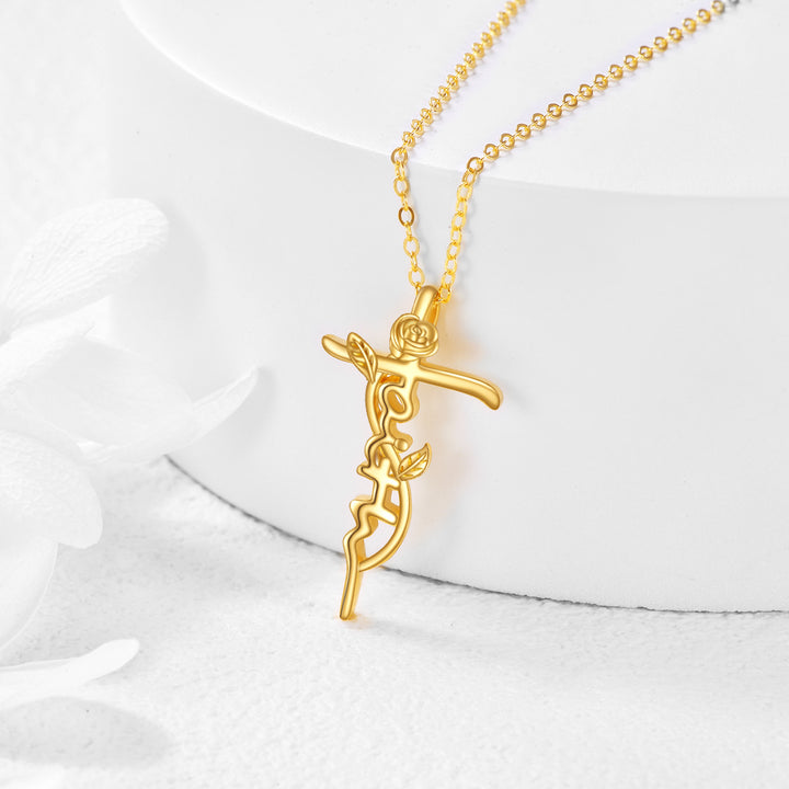 This 14K Gold Rose & Cross Pendant Necklace by YFN is a no-stone, exquisite necklace for women. Crafted in 14K gold, the cross pendant is elegantly rendered in rose gold, exuding a classic charm and pure elegance without stones.