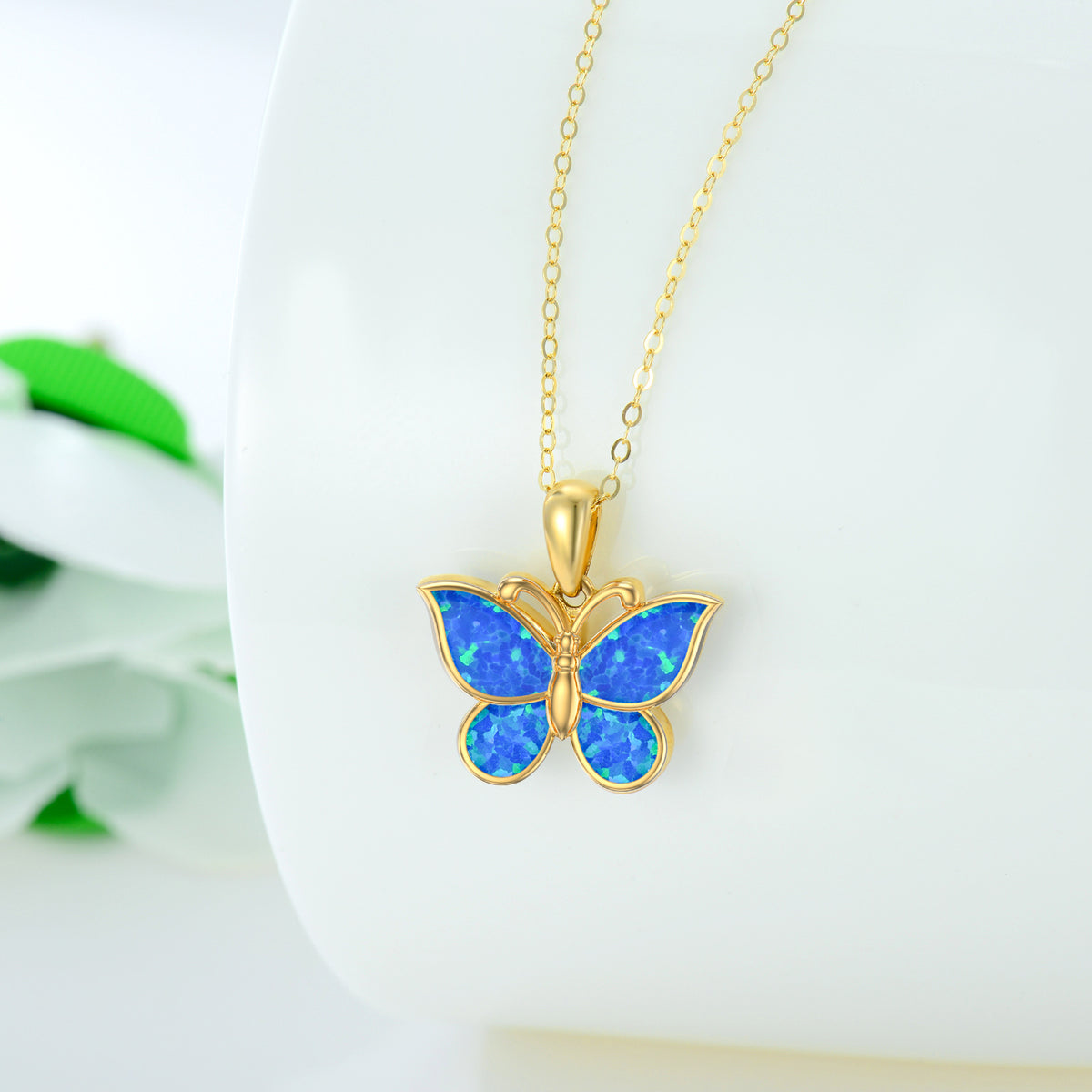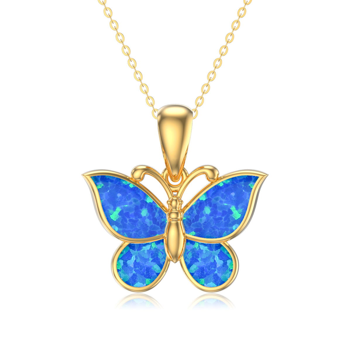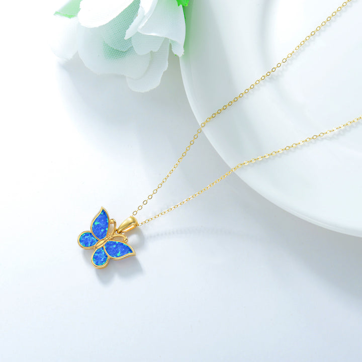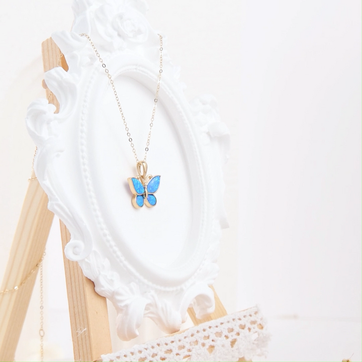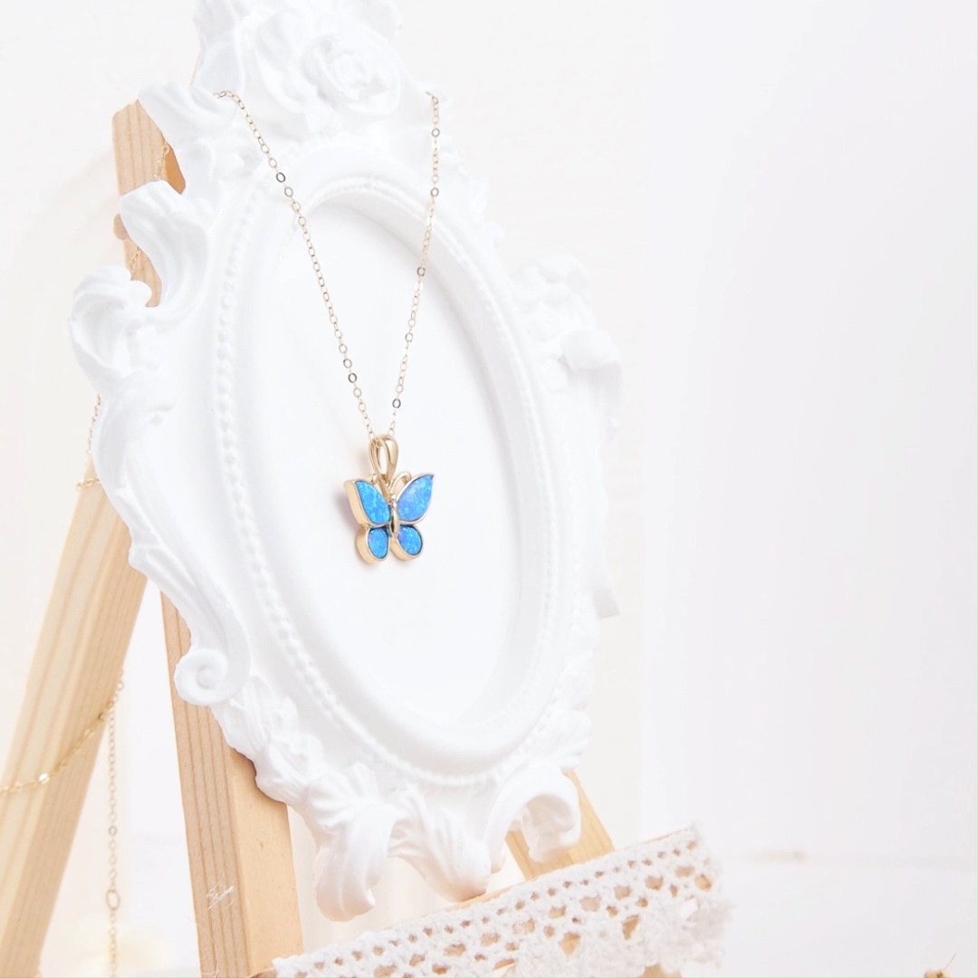 14K gold; blue opal butterfly centerpiece; gold chain; pendant setting.