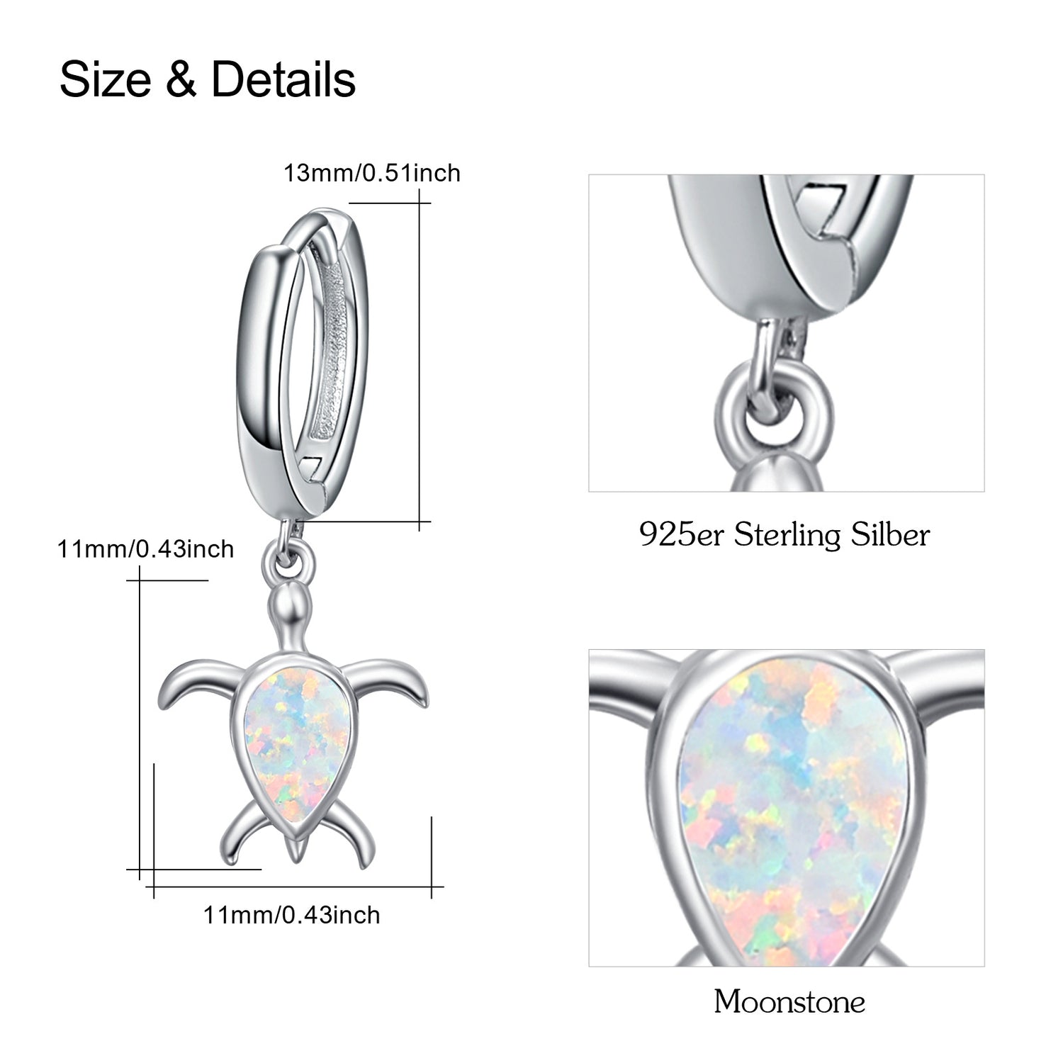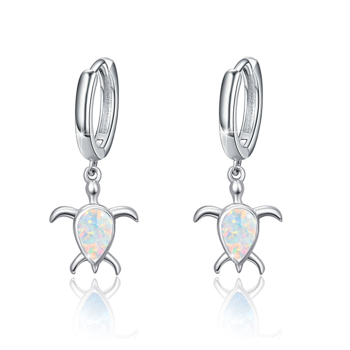 Crafted from Sterling Silver, these drop earrings feature a Pear Shaped Opal set within a Sea Turtle design and are enhanced with White Gold Plating.