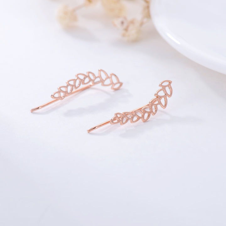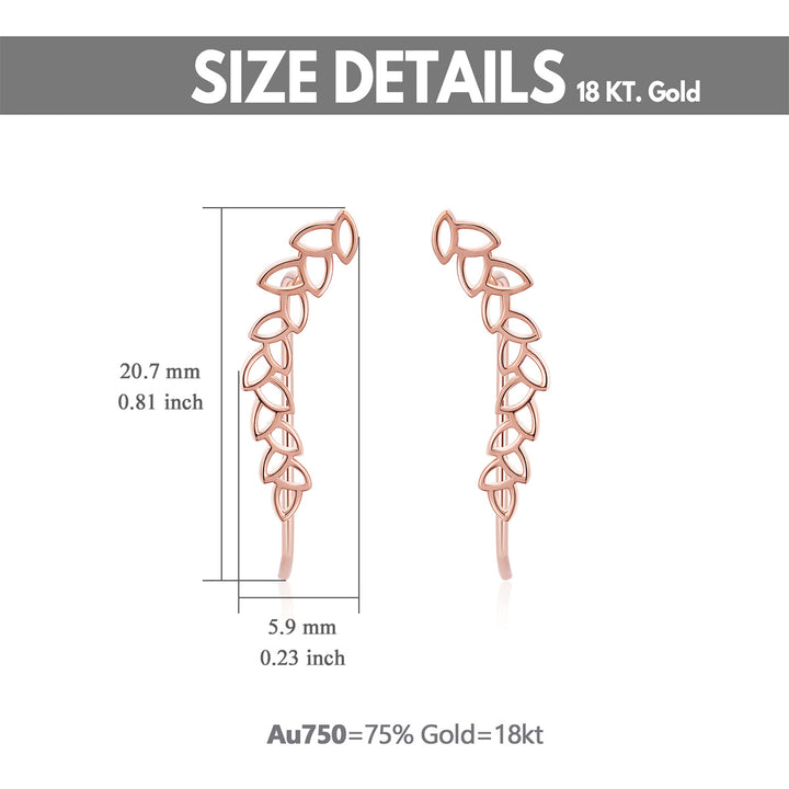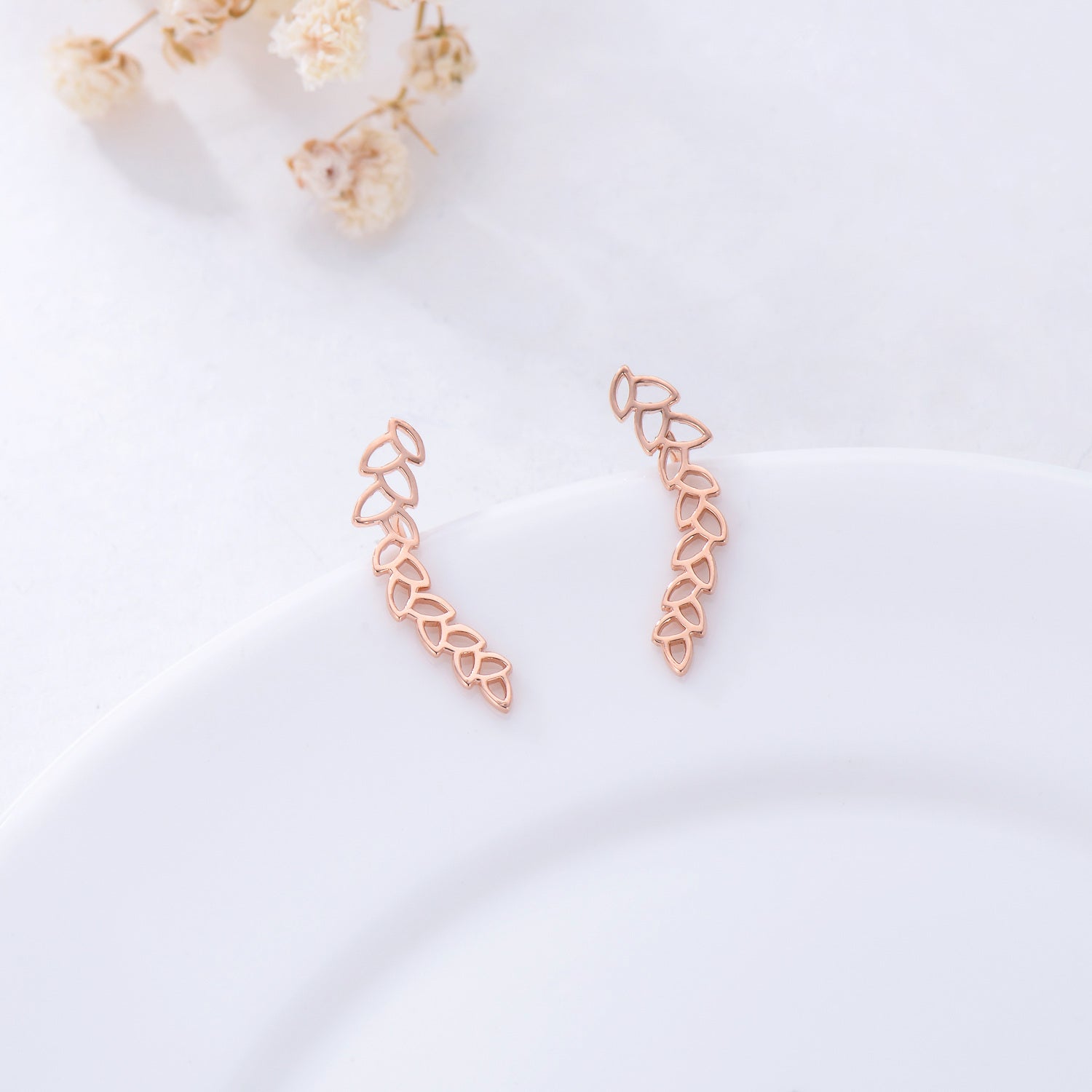 These 18K Rose Gold Leaves Climber Earrings by YFN offer a refined blend of natural elegance and contemporary design. The graceful leaf motif curves upward along the ear for a sculpted, organic silhouette that feels both modern and timeless. With no stones detracting from their fluid form, these climbers showcase pure metal artistry and bring a soft, feminine polish to any look. Ideal for women who appreciate minimalistic luxury, they illuminate the ear with warm rose-gold radiance.