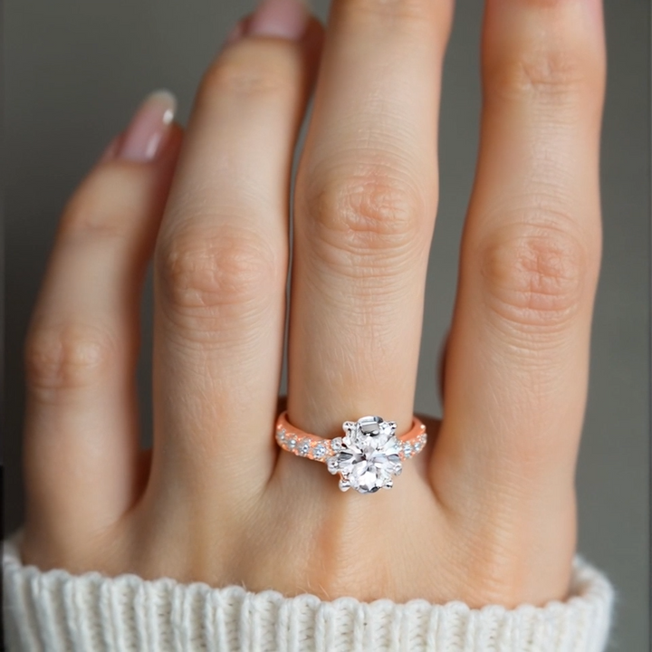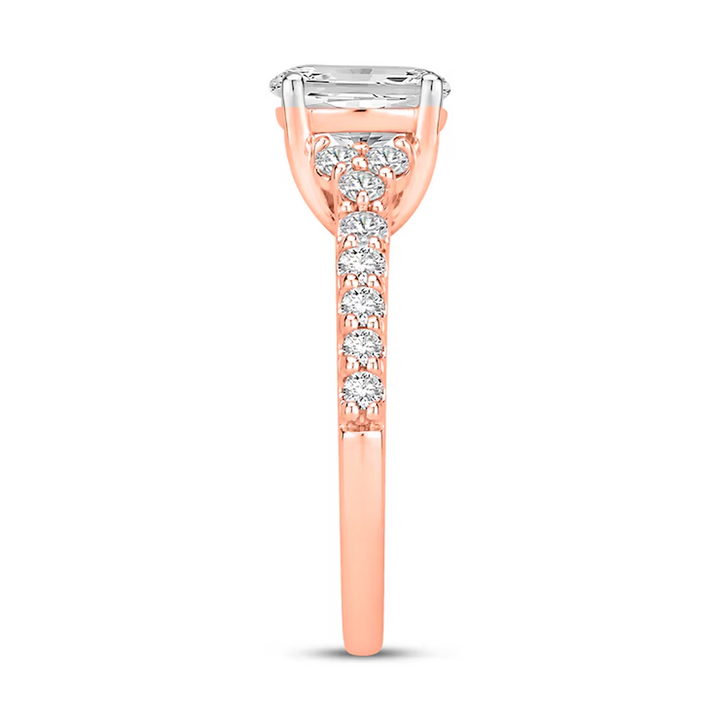 Solid 14K rose gold engagement ring. Center stone: Oval lab-created diamond (D color, VVS1 clarity; 0.5 to 3 CT range). Total weight: 1 to 3.5 CT. Features Excellent (3EX) cut, polish, and symmetry. IGI Certified.