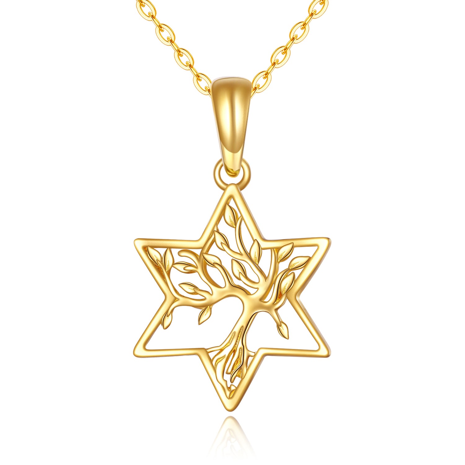 Crafted in solid 14K gold. Stone-free pendant featuring Tree of Life and Star of David motifs. Includes matching gold chain.