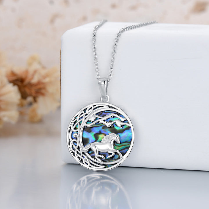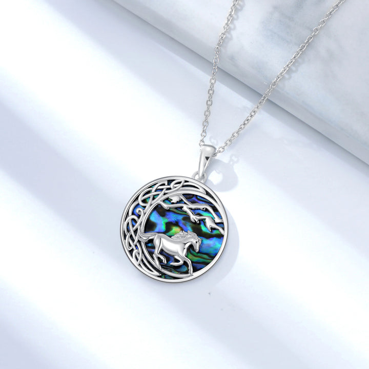 This Pendant Necklace is crafted from Sterling Silver with White Gold Plating, featuring a Stunning Abalone Shellfish Horse design intertwined with a Celtic Knot.