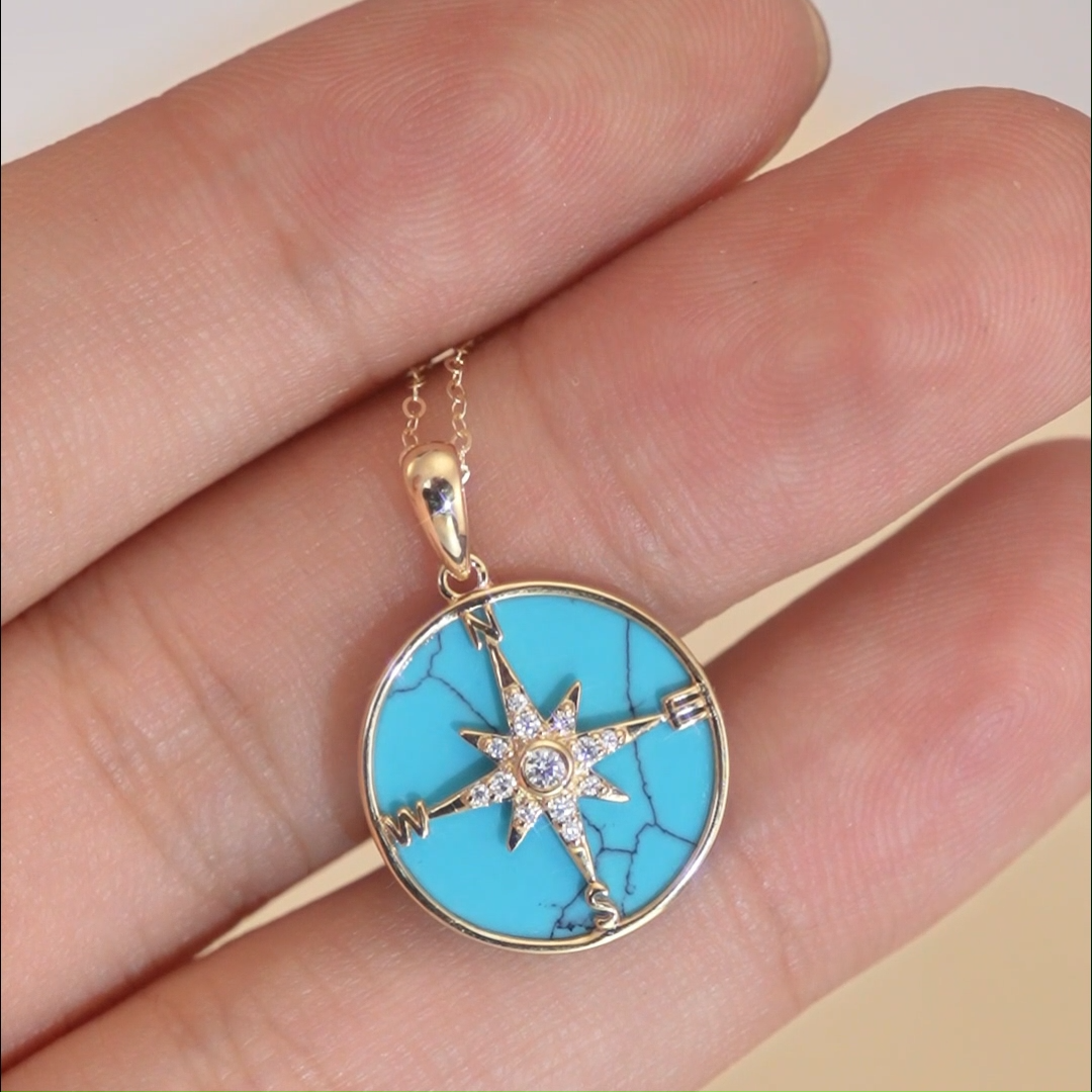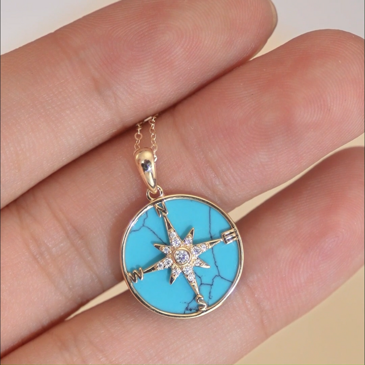 This 14K Gold Round Turquoise Compass Pendant Necklace by YFN captures the spirit of adventure and personal direction through its striking compass motif set around a vivid turquoise gemstone. Turquoise represents protection, wisdom, and emotional clarity, while the compass symbolizes guidance and purpose. Crafted in radiant 14K gold, the pendant blends timeless elegance with meaningful artistry, making it ideal for women who love jewelry with both style and symbolism. Whether worn daily or on special occasions, this piece inspires intention and wanderlust while adding a refined, luxurious touch to any ensemble.