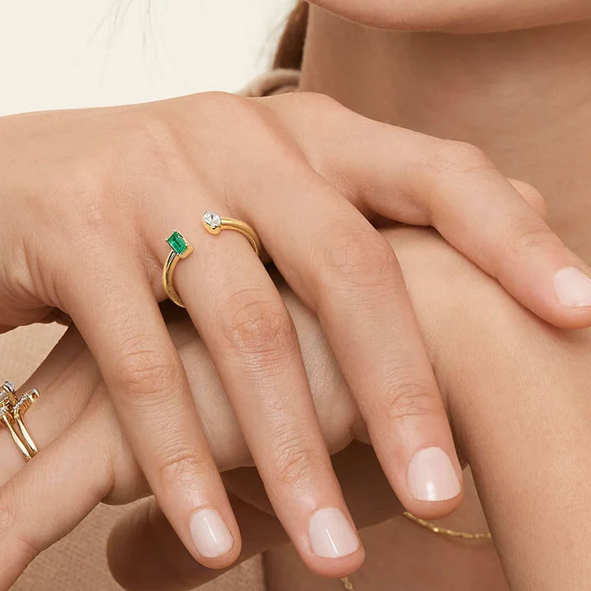 This 18K Gold 0.25 CT Marquise Cut Lab Created Diamond & 0.25 CT Emerald Cut Lab Created Emerald Open Band by YFN is an exquisite, luxurious open ring perfect for couples or women. This solitaire ring is set in 18K Gold and features a stunning marquise shape with lab-created diamonds and emeralds, totaling 0.25 CT. The stones boast dazzling D color and VVS1-VS1 clarity with exceptional polish, cut, and symmetry.