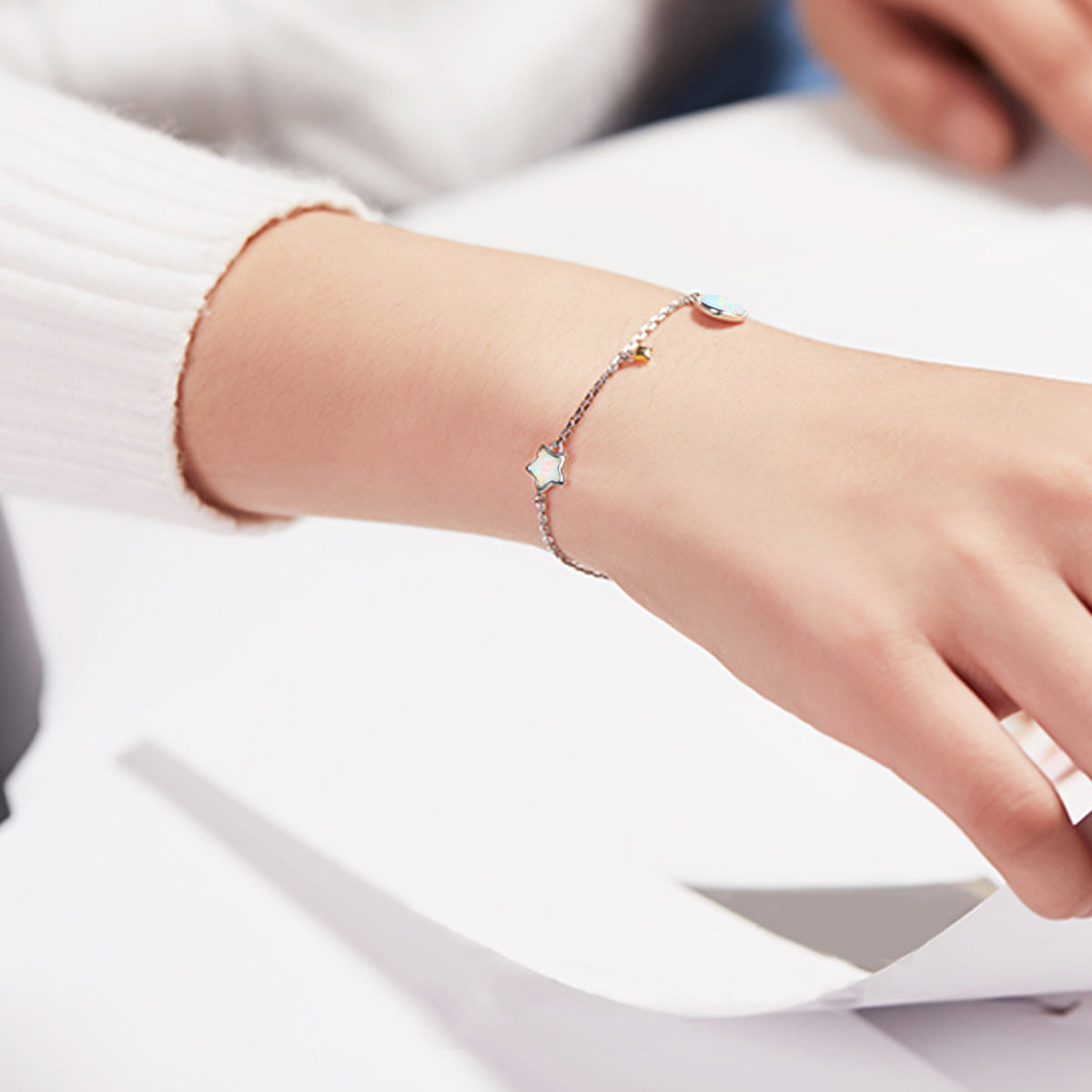This Opal Moon & Star Charm Bracelet by YFN is an enchanting accessory that captures the mystique of the celestial realm. The sterling silver bracelet, plated in white gold, features a charming moon and star motif, beautifully accented by a mesmerizing opal centerpiece that displays a unique play of colors. This piece is perfect for the woman who appreciates elegance and a touch of whimsy, offering a lustrous, sophisticated look for any occasion.