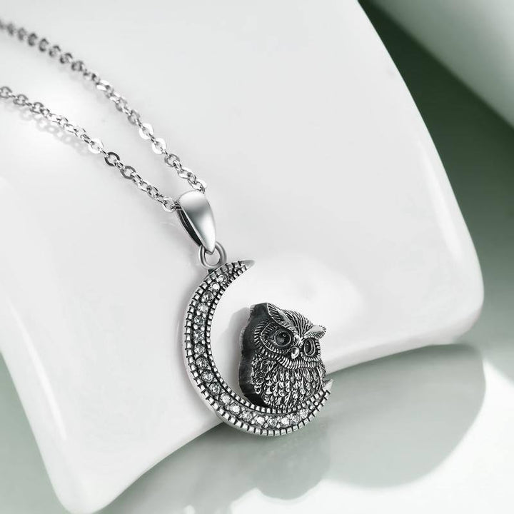 Crafted from high-quality Sterling Silver, this circular Urn Necklace features a round, clear Cubic Zirconia, an Owl & Moon design, and a Retro Silver finish.