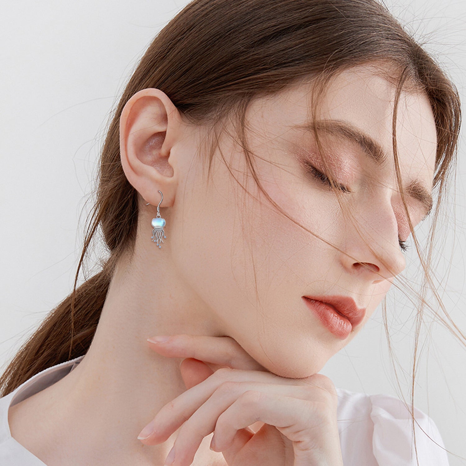 Sterling silver; moonstone; white-gold plating; jellyfish drop design; earring hooks.