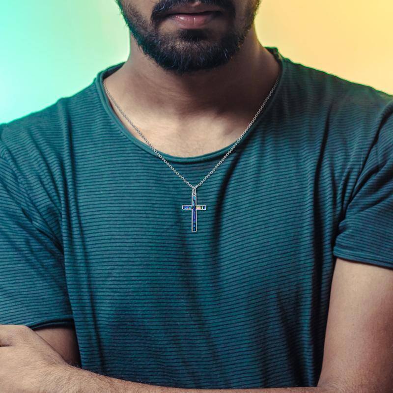 This Sterling Silver Abalone Shellfish Cross Pendant Necklace by YFN showcases iridescent abalone inlaid into a classic cross motif. The interplay of color and silver creates a striking unisex piece, enhanced with white gold plating for added refinement.