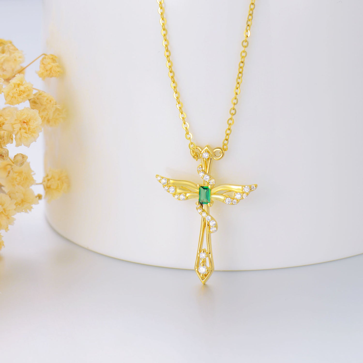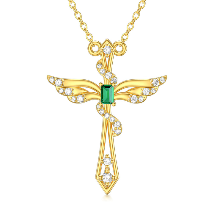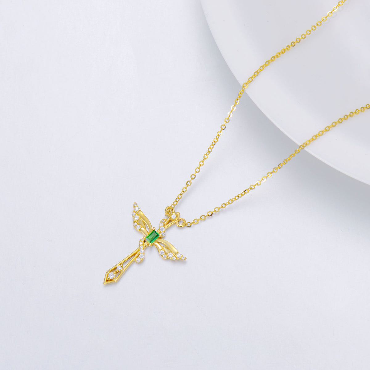 14K Gold Princess-square Shaped Emerald Angel Wing & Cross Pendant Necklace