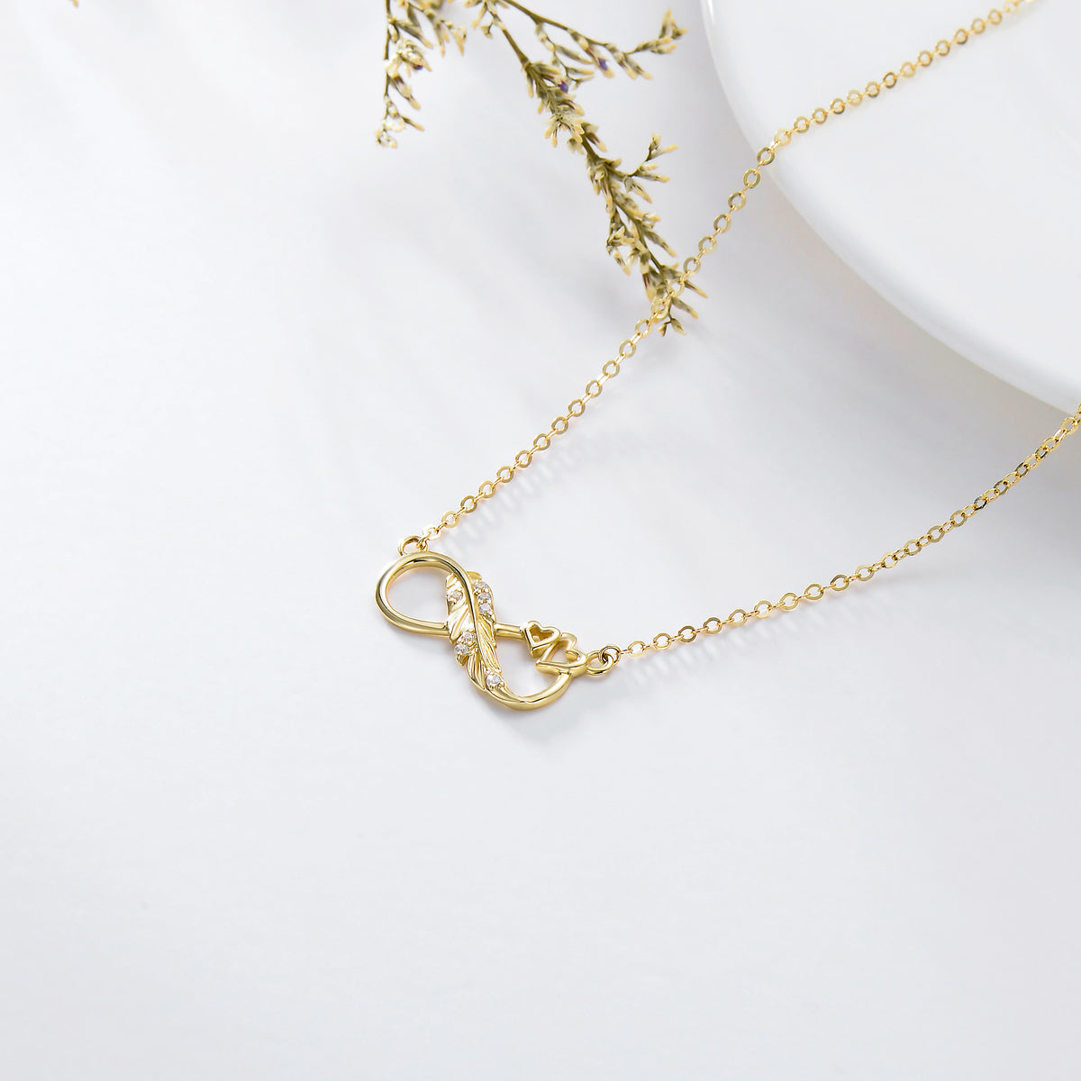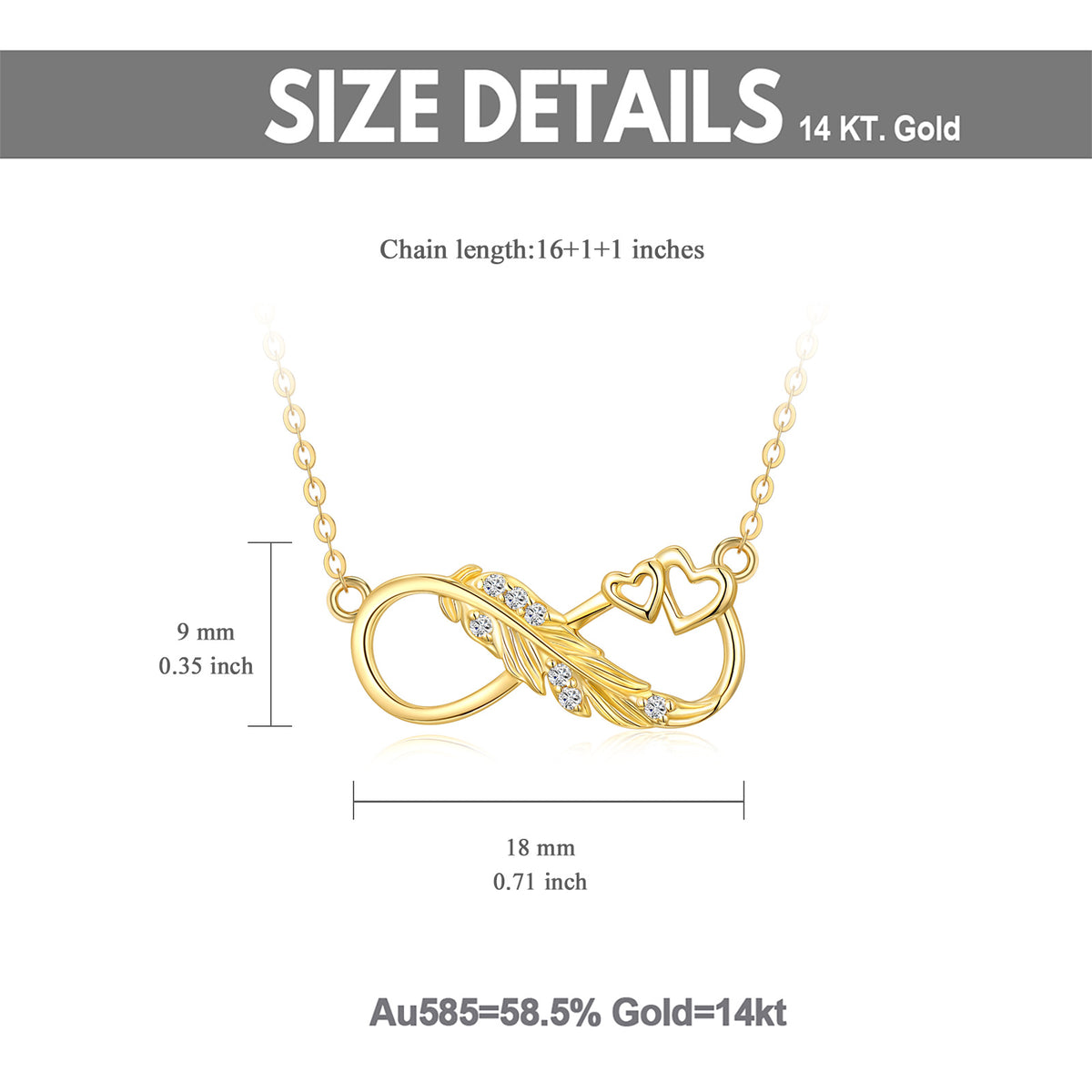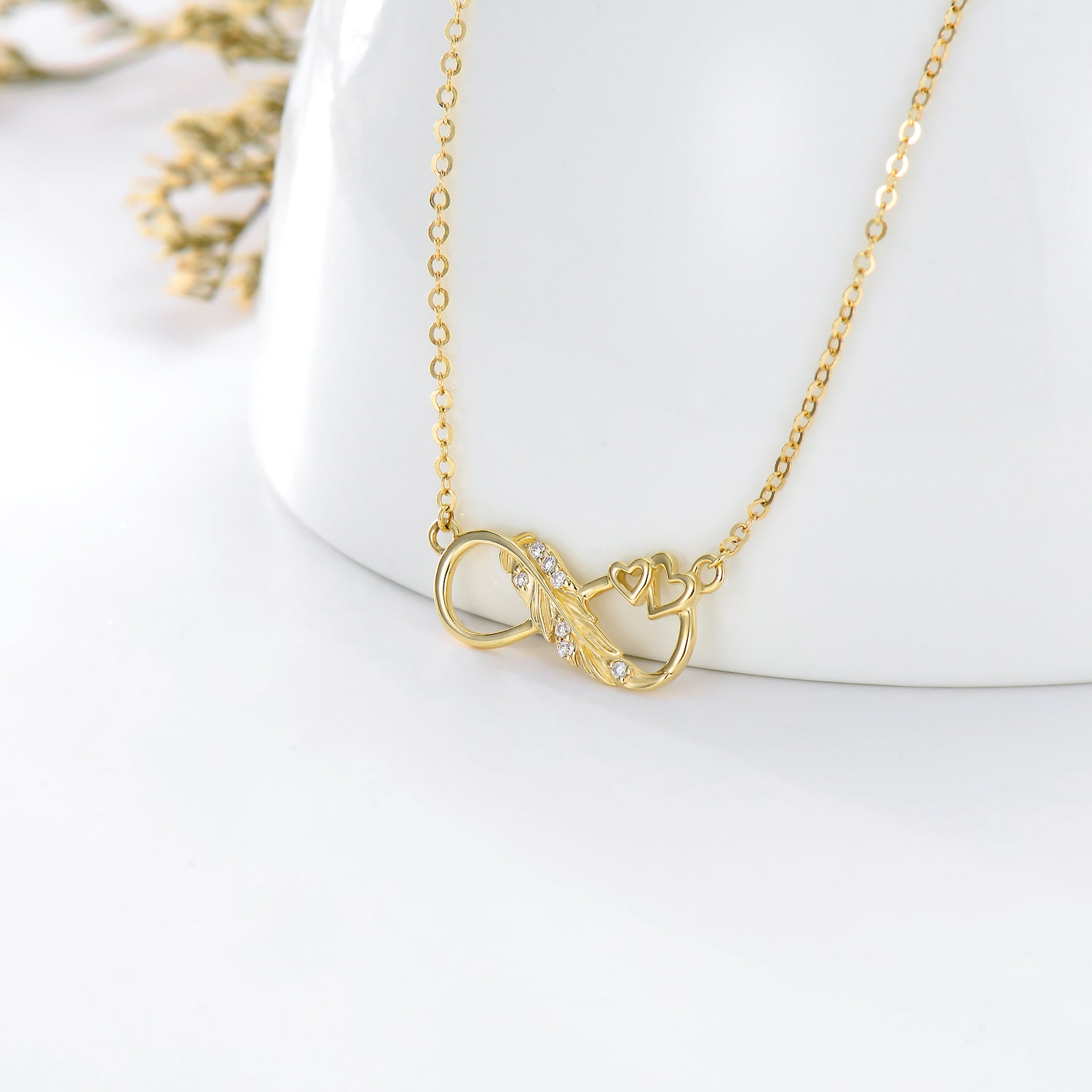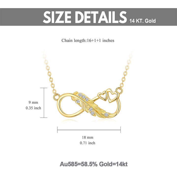 This Pendant Necklace is crafted from Premium 14K Gold, Featuring a Sparkling Cubic Zirconia and a Delicate Feather and Infinity Symbol Design.