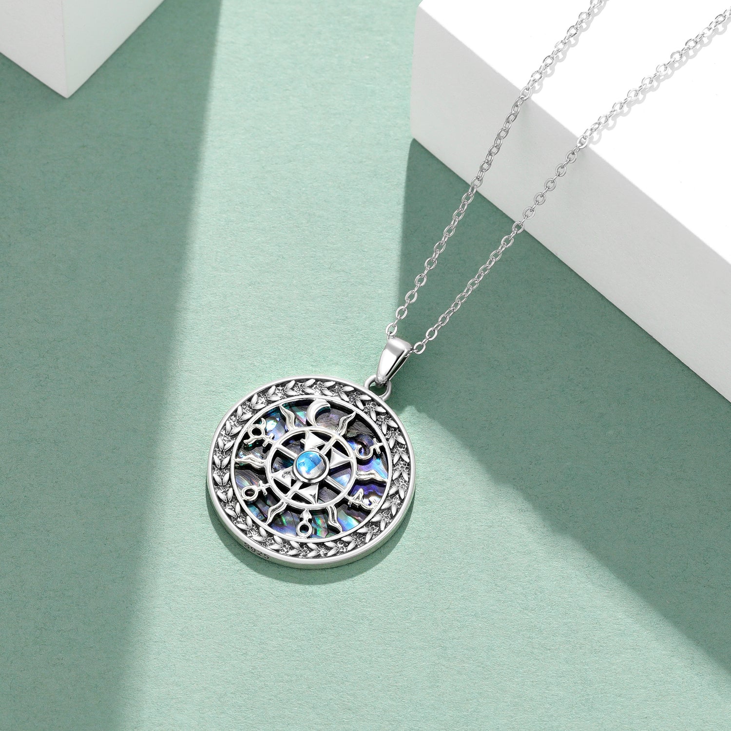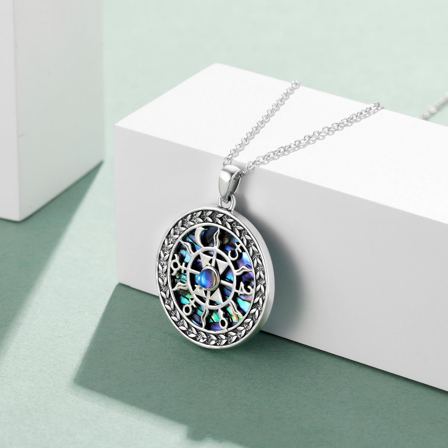 Sterling silver. Round moonstone and abalone shell inlay. Celtic knot motif. Includes chain.