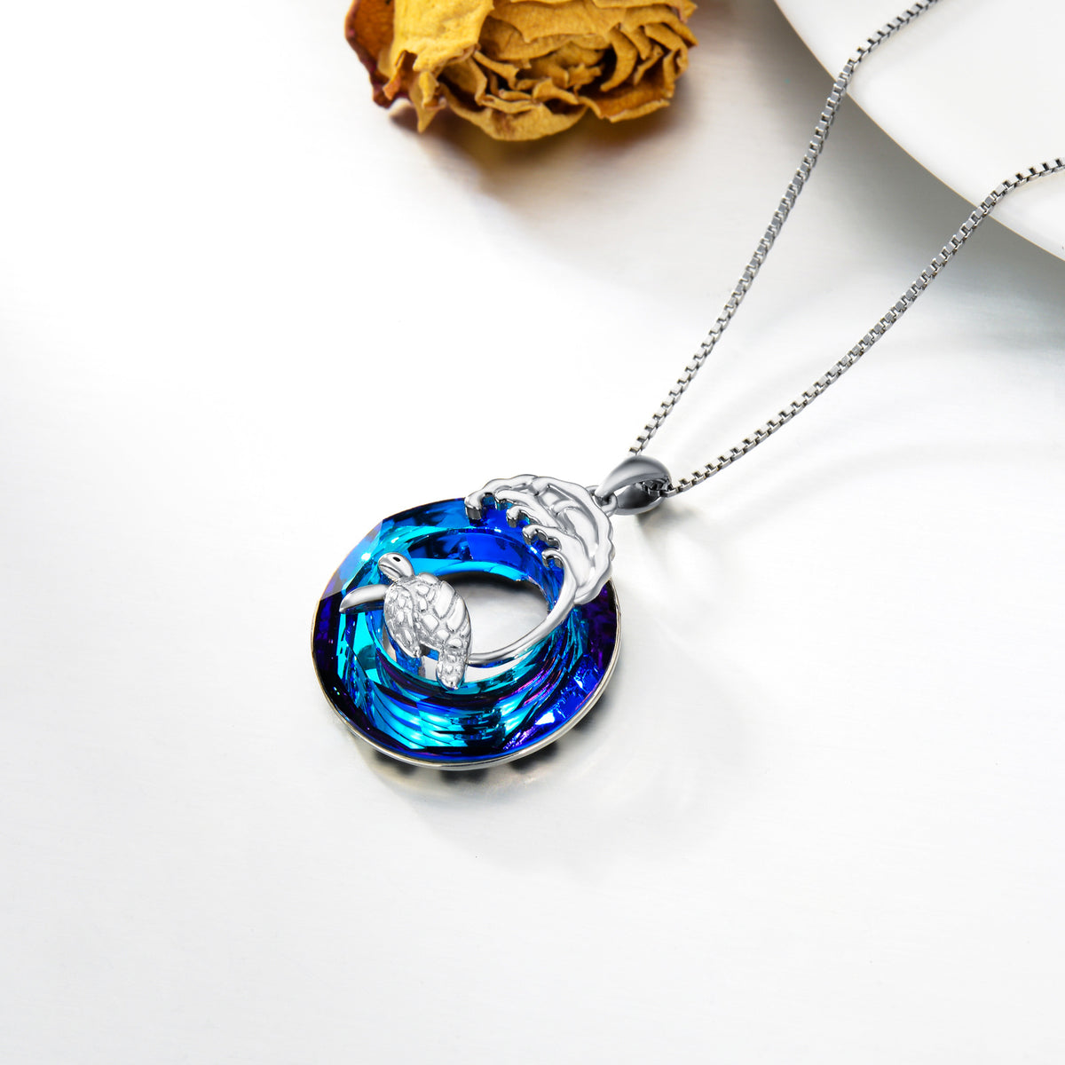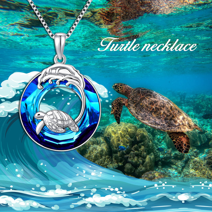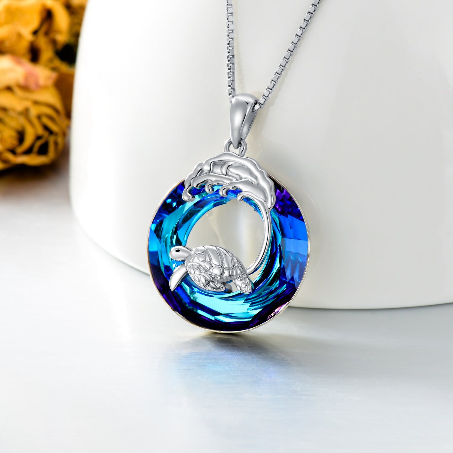 This Circular Shaped Crystal Pendant Necklace is crafted from Sterling Silver and Spray-Plated in White Gold, featuring a Mesmerizing Blue Crystal and a Charming Sea Turtle Motif.