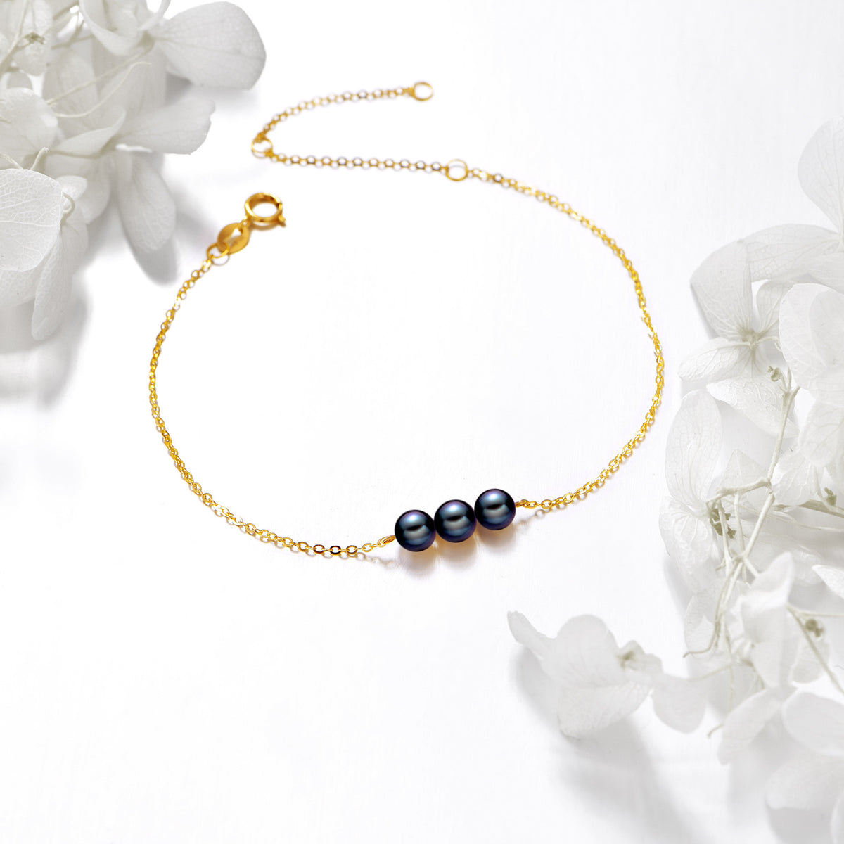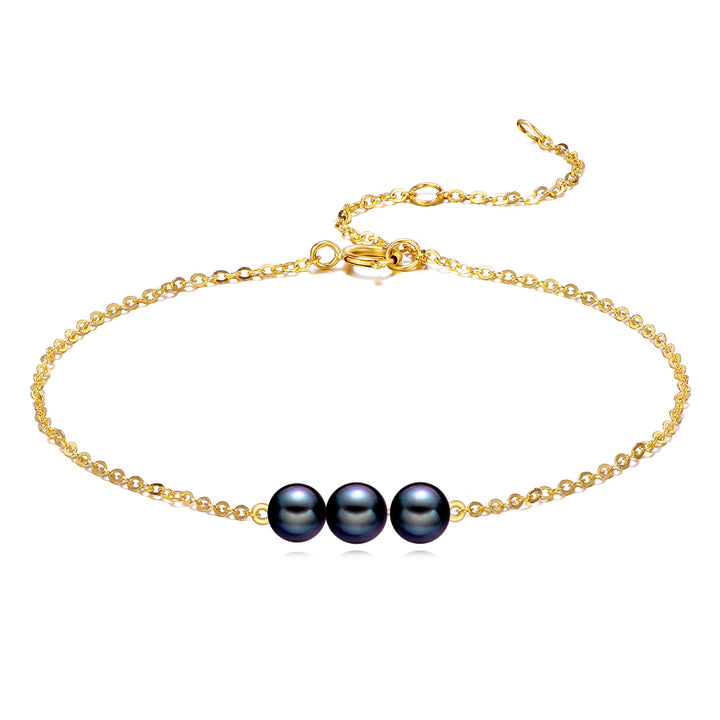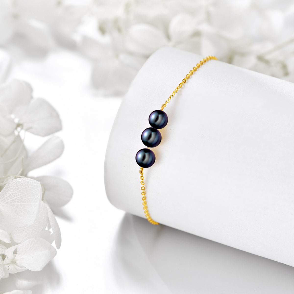 This charm bracelet is made of high-quality 14K gold and features a delicate arrangement of lustrous freshwater pearls along the chain.