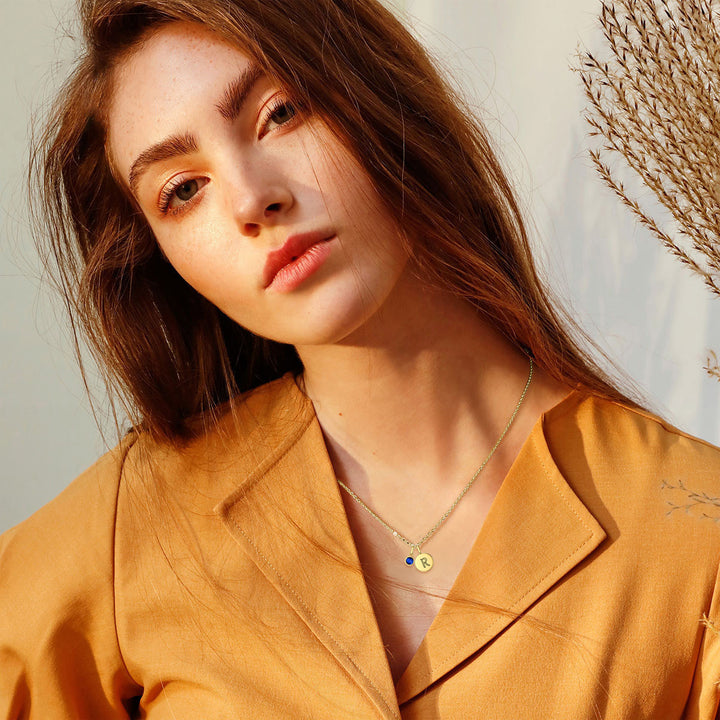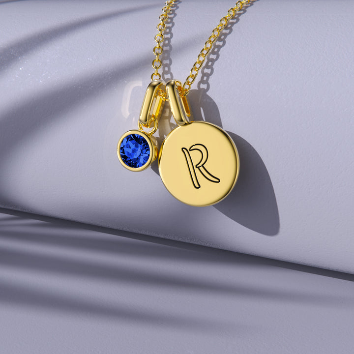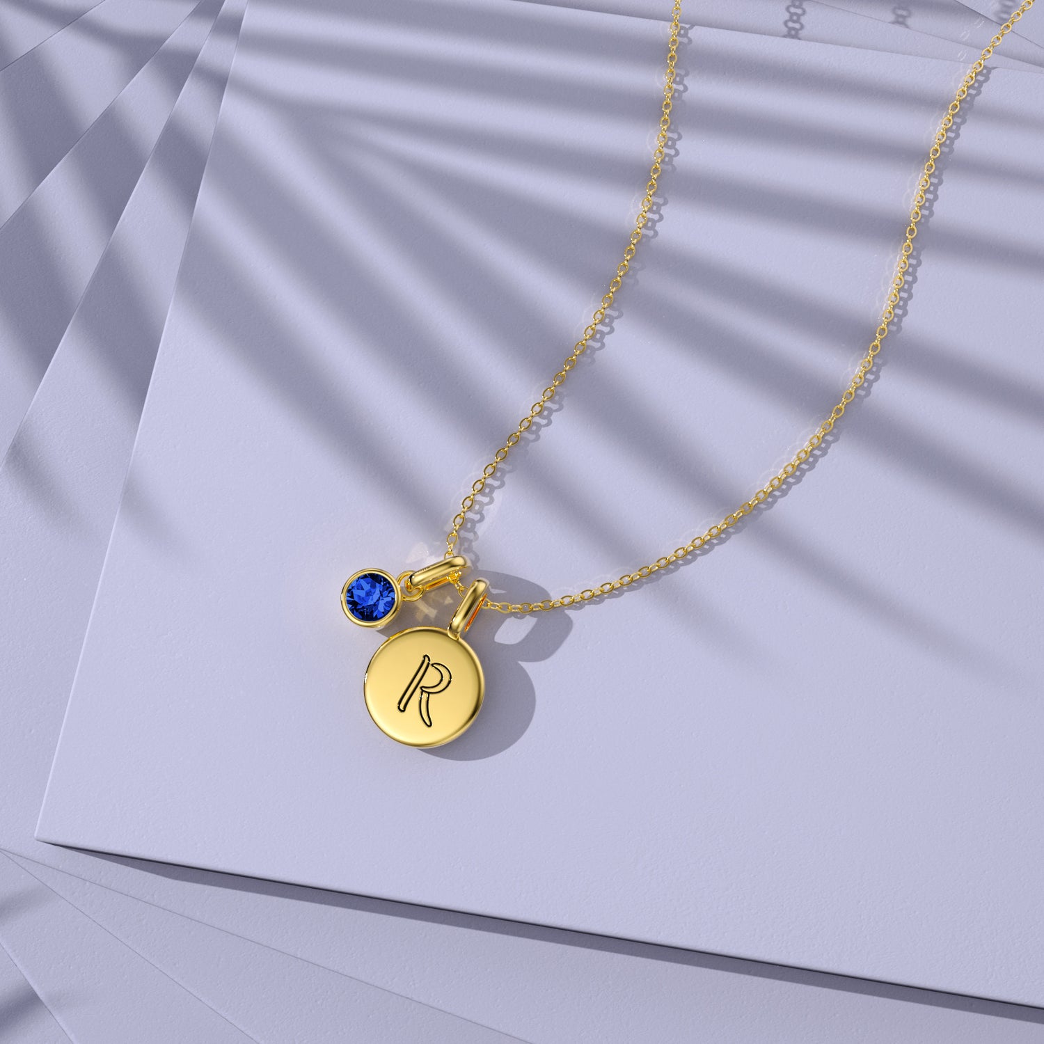 This Circular Shaped Pendant Necklace is Crafted from Premium 18K Gold, adorned with Brilliant Cubic Zirconia and a Personalized Birthstone.