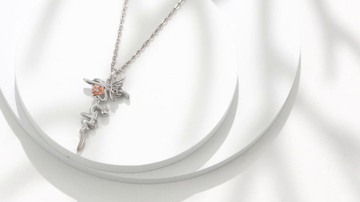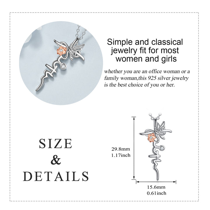 This Circular Cubic Zirconia Butterfly With Rose With Cross Pendant Necklace by YFN is a versatile piece that elegantly combines faith, nature, and romance. The sterling silver pendant, accented with warm rose gold, features intricate designs of a butterfly, rose, and Cross, all set within a circular shape and illuminated by dazzling Cubic Zirconia stones. This necklace is a sophisticated reflection of style and spirituality for the modern woman.