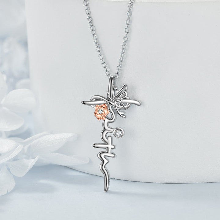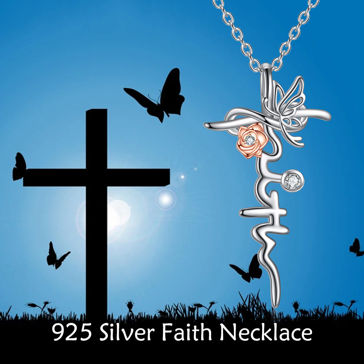Sterling Silver Two-Tone Circular Cubic Zirconia Butterfly With Rose With Cross Pendant Necklace With Engraved Word For Women